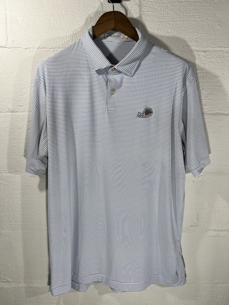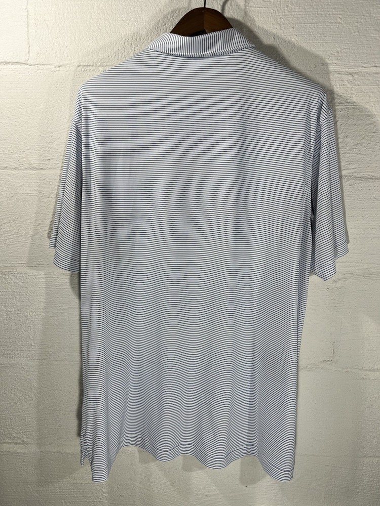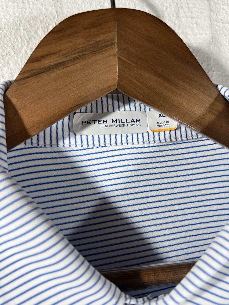 The Peter Millar Pine Needles featherweight Golf Polo in Men's XL is a stylish and comfortable option for golf enthusiasts. Made of polyester with a UPF 50+ rating, this short sleeve polo features a collared neckline and button closure. The striped design in blue gives it a classic and preppy look, perfect for summer activewear occasions like golf, tennis, or rugby. Easy to care for, this machine washable polo is a versatile addition to any man's wardrobe, representing the quality and style expected from Peter Millar.