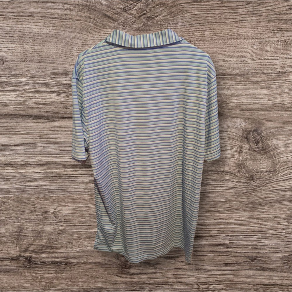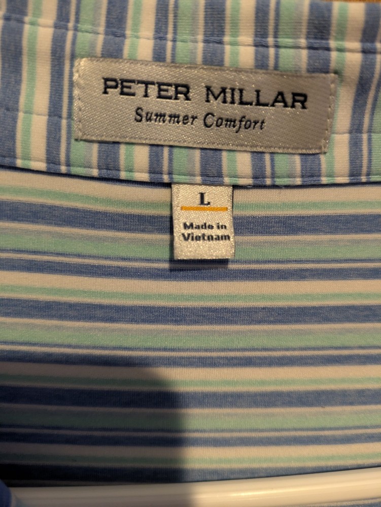 The Peter Millar Summer Comfort Golf Polo in Blue, White, and Pink Striped is a stylish and comfortable option for casual wear. Made from a blended fabric of polyester and spandex, this lightweight polo features a collared neckline with a button closure, short sleeves, and a spread collar style. With a chest size of 52 inches and a regular fit, this shirt is perfect for outdoor activities like golfing, making it an ideal choice for all seasons. Made in Vietnam, this polo from the Peter Millar Summer Comfort collection is a great addition to any man's wardrobe.