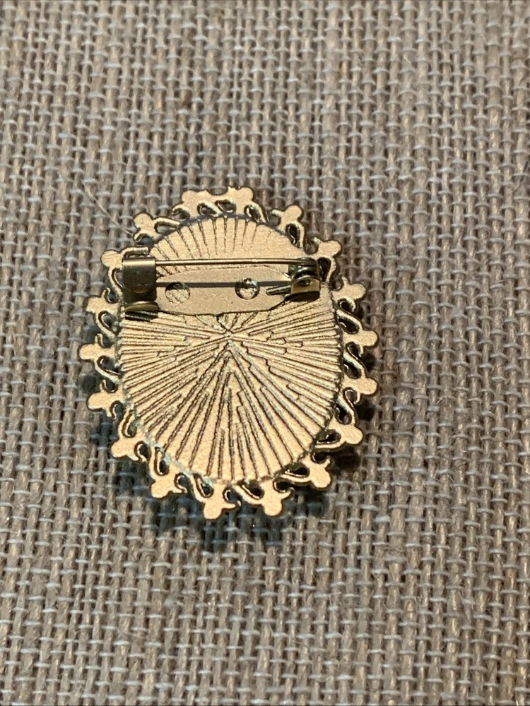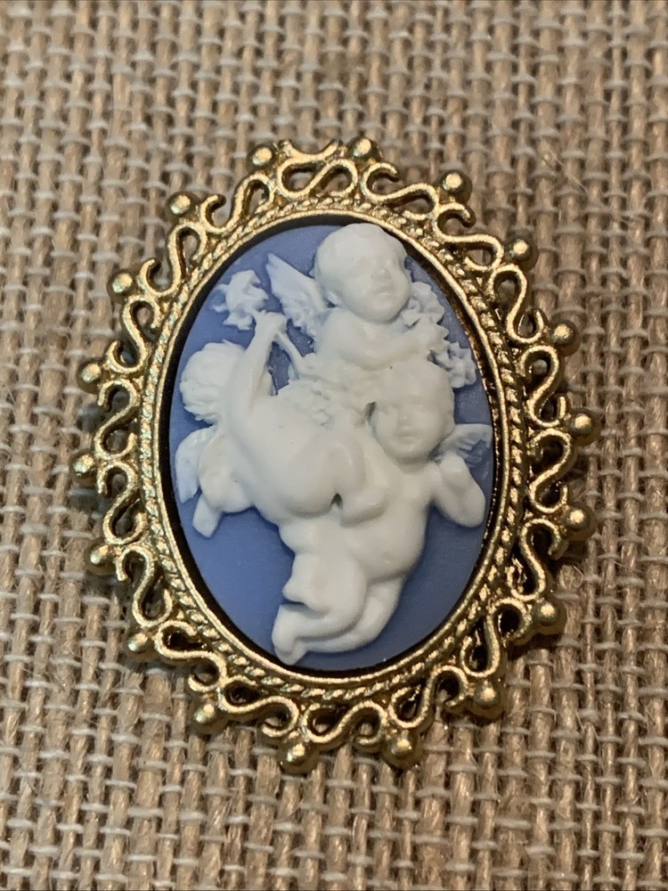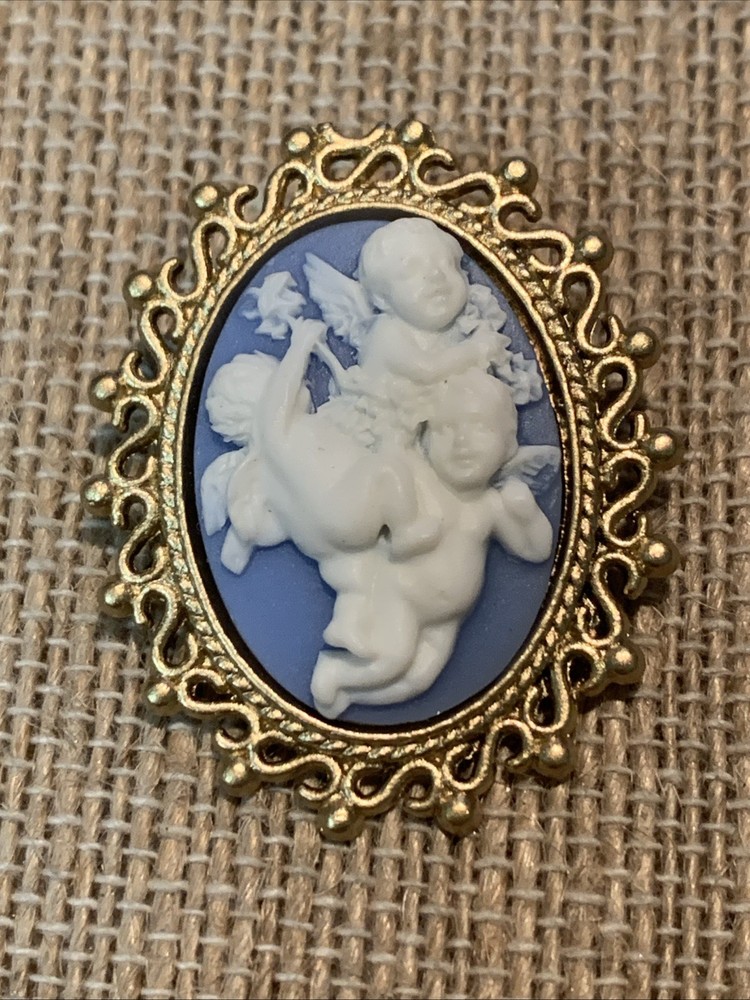 This lovely petite brooch features a 25x18mm, raised-relief cameo of 3-playful cherub/ Angels. This would make such an ideal gift for a special, loved one and would be a treasured piece that could be passed down from generation to generation. The cameo has a soft, light blue background, with a soft alabaster white raised relief image. The cameo is set in a vintage, gold tone, open-work Victorian-styled setting with a locking pin bar on back (see photos) so this lovely piece can be as a brooch. The total size of the brooch is 1 1/2" x 1 1/8". This charming piece is brand new/never worn. SHIPPING COST INCLUDES TRACKING AND DELIVERY CONFIRMATION**** **** SHIPPING FEES ARE NOT REFUNDABLE**AND RETURN SHIPPING IS TO BE PAID BY BUYER**