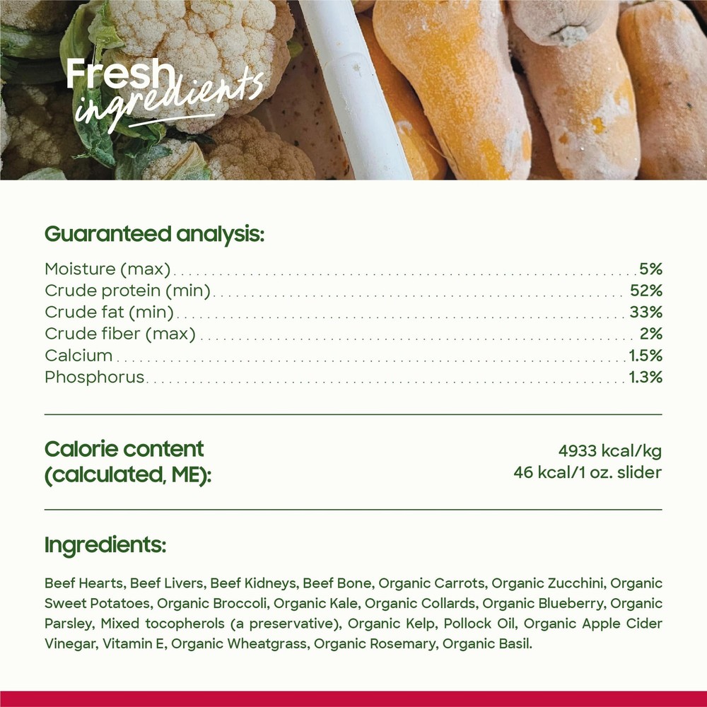 Pets Freeze-Dried Raw Food for Dogs, Beef Recipe, offers a nutrient-rich meal for your dog. Crafted with 88% grass-fed beef, including beef hearts, livers, kidneys, and bones, along with 10% organic produce like carrots, sweet potatoes, kale, and blueberries, this dry dog food formula ensures your dog gets the essential nutrients they need. It also contains 2% natural supplements, such as pollock oil, organic apple cider vinegar, and , supporting overall . Made in the USA with humanely raised, single-source protein, this freeze dried food for dogs is both nutritious and ethical. Formulated to meet AAFCO standards for all life stages (except large dog breeds), 's Beef Recipe is a complete and balanced raw diet for dogs. The easy-to-prepare freeze-dried raw dog food patties require only a quick rehydration. Just mix ½ cup of warm water for every 4 sliders, crush, let sit for a few minutes, and serve. Use as a complete meal, a freeze dried dog food topper or a dog treat. Treat your dog to a natural, organic, and healthy raw diet with Pets dog food freeze dried. High Protein Raw Dog Food: Pets raw freeze dried dog food made with 88% grass-fed beef, 10% organic produce, and 2% natural supplements to optimal canine . Single Source Protein: Grass-fed beef hearts, livers, kidneys, and bones ensure a natural, wholesome source of protein and nutrients in this healthy dog food. Complete & Balanced: Meets AAFCO nutrient profiles for all life stages (excluding large-size dogs) with essential vitamins, minerals, and supplements. Easy to Rehydrate: Simply mix with water to serve. Crush sliders and rehydrate for a few minutes, creating a nutritious meal for your dog. Can also use as a dog food topper or dog treat. USA Made & Organic: Our grain dog food for adult dogs and puppies is crafted in the USA with organic, humanely raised ingredients, ensuring a quality, nutritious raw diet for your dog.