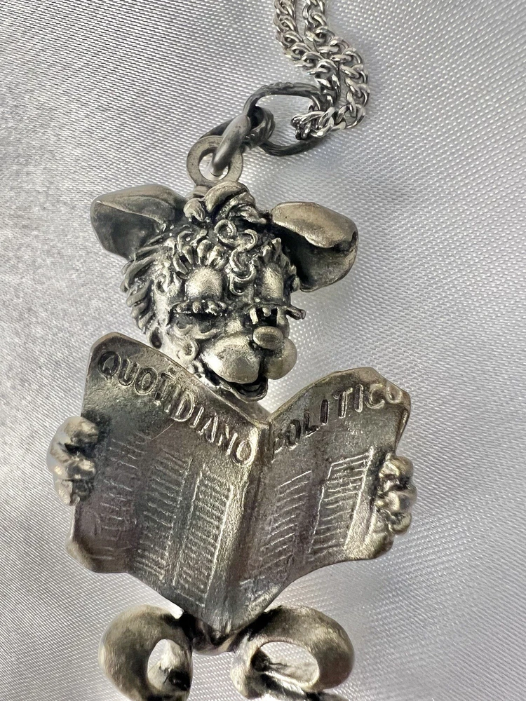 This vintage necklace features an adorable pewter poodle reading a newspaper. The pendant hangs from a delicate chain and is a perfect accessory for any dog lover. The piece has a distinctive style and can be worn on any occasion. The brand of the necklace is unbranded and it falls under the category of jewelry and watches. The necklace is pre-owned but remains in excellent condition. It is a unique and eye-catching piece that will undoubtedly attract attention. The pendant is perfect for those who appreciate vintage and antique jewelry, and it will make an excellent addition to any collection. A42