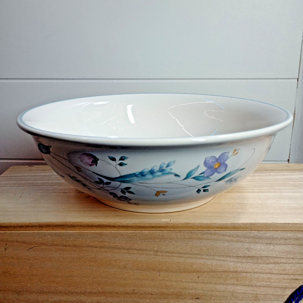Crafted with care, the Pfaltzgraff April Serving Bowl is a blend of functionality and beauty, perfect for any occasion. The bowl features a charming floral pattern set against a glossy white background, making it a striking addition to your serving collection. At 8.5 inches in diameter and 2.75 inches in height, it's just the right size for a variety of dishes. This ceramic serving bowl comes from Pfaltzgraff's esteemed April product line, renowned for its art pottery production style. Made in the USA between 1990 and 1999, it showcases the craftsmanship of the late 20th century. The piece is an original, featuring the iconic impressed backstamp, and is produced with techniques that ensure its high quality. Whether used for a special dinner or as a decorative display piece, this bowl is sure to be treasured. Measures 8.5" in diameter, and approximately 3" in depth