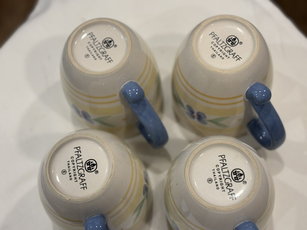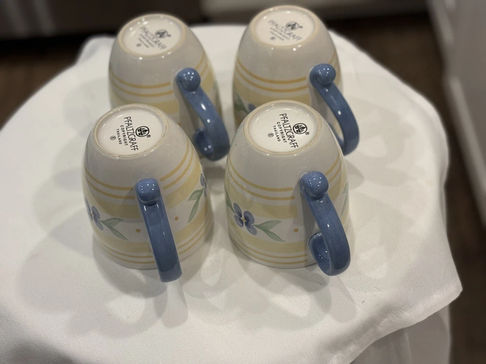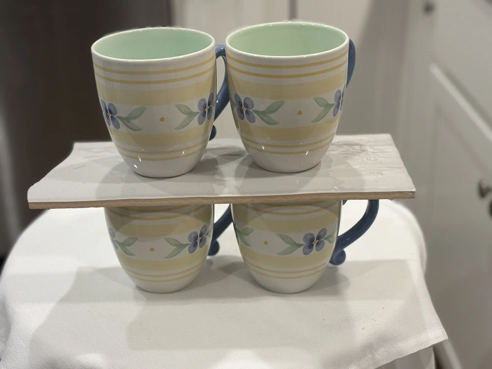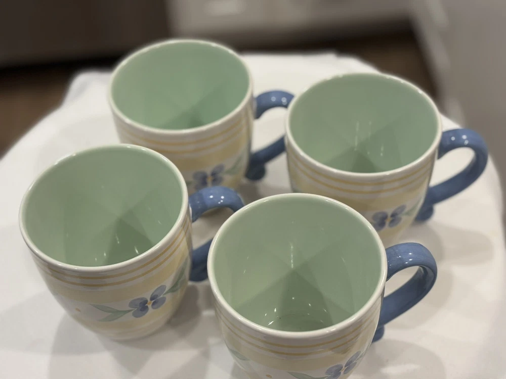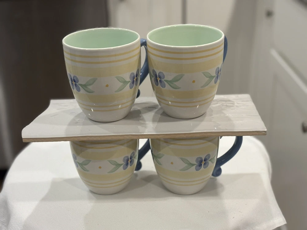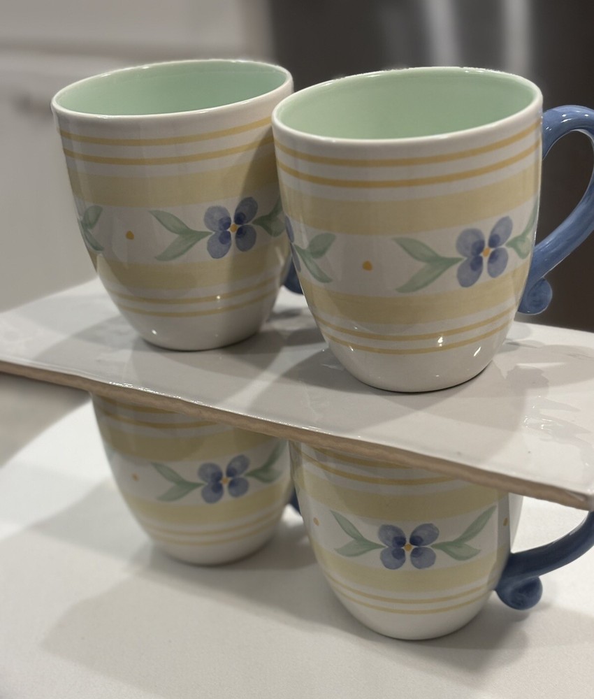 The "Summer Breeze" Pfaltzgraff Mugs Set features a vintage Four-Piece collection of round mugs with a capacity of 14-16 oz. each. Manufactured in 1990, the mugs are decorated with a colorful floral pattern of blue flowers and yellow plaid trellis, adding a touch of summer charm. These contemporary-style mugs are microwave and dishwasher safe, making them convenient for everyday use. Crafted from stoneware with a glossy finish, these mugs are a delightful addition to any table setting for all occasions. Return accepted within 30 days; buyer pays return shipping Thank you for your consideration