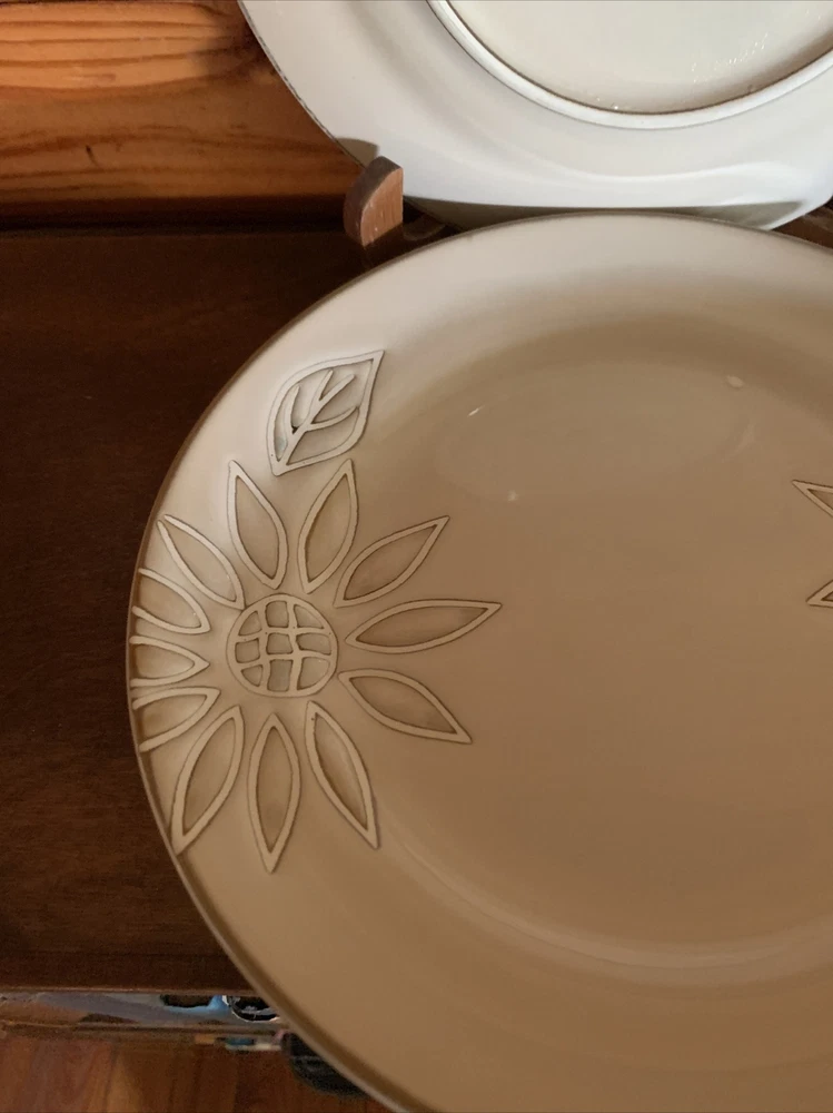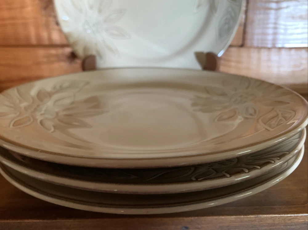 Elevate your dining experience with the Pfaltzgraff Daisy Chain Salad Plates, a set that exudes a timeless Arts & Crafts/Mission Style charm. Each plate features an embossed floral pattern, delivering a touch of elegance to your table setting. The glossy finish enhances the beige stoneware's durability and adds a lustrous appeal that is sure to complement any meal. With a plate diameter of 8.5 inches, these salad plates are the perfect size for presenting your favorite greens and desserts. Crafted in 2009, this four-piece set brings both contemporary originality and a floral theme to your dining occasions, making it a delightful addition to your dinnerware collection. Pfaltzgraff Daisy Chain Salad Plates 8.5” (Set of 4). Condition is "Used". Shipped with USPS Priority Mail. I have two sets of these with 4 salad plates in each set. The price listed is for one “set of 4”. The material is extremely substantial in weight. These are beautiful everyday dishes by Pfaltzgraff made from heavy stoneware that can go from oven to table to dishwasher without issue. The Daisy Chain pattern in neutral beige and swirled browns and creams will fit any kitchen decor. Complete your set or start a new collection today with this retired pattern produced from 2009-2013. These salad plates have no chips, cracks or crazing and show only light signs of use with regard to utensil marks or discoloration. Thank you for looking.