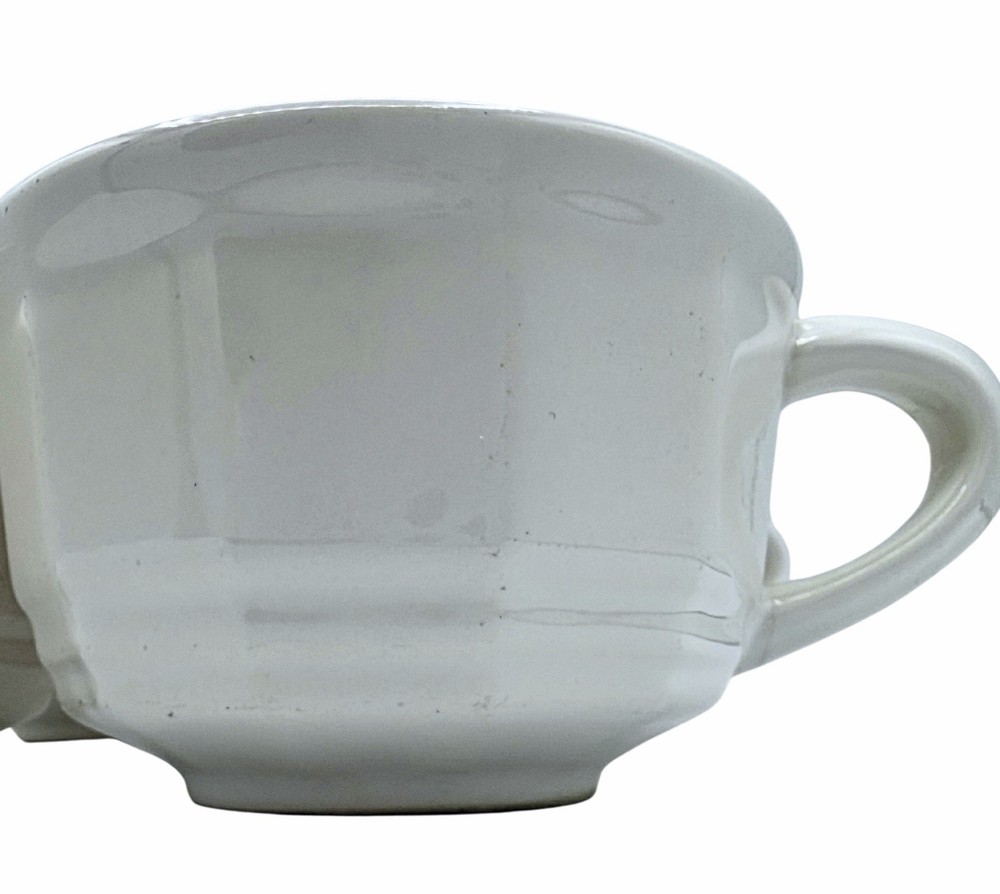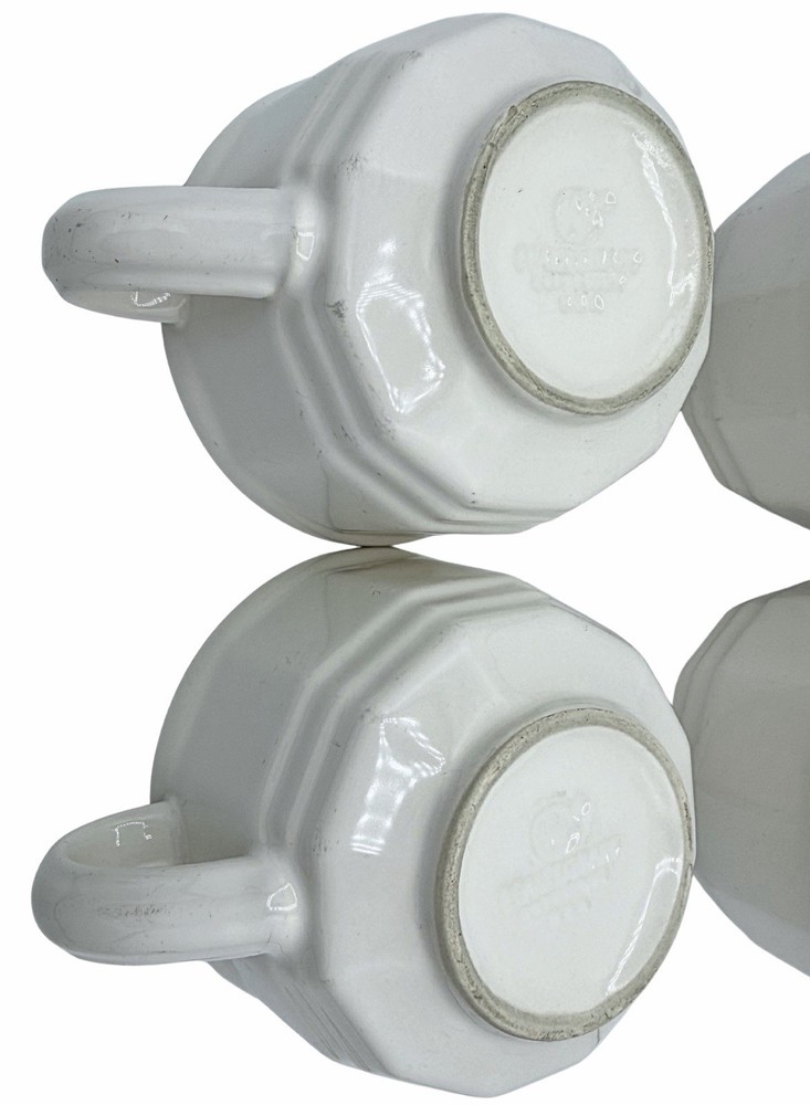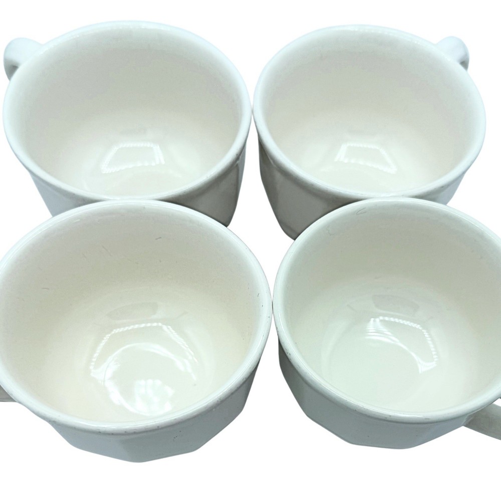 Set of 4 Pfaltzgraff Heritage White stoneware cups. Classic octagon paneled shape designed by Ben Seibel. Heavy, durable stoneware. Great for everyday use or replacement pieces. Pattern: • Pfaltzgraff Heritage White Item: • set of 4 cups/mugs Features: • octagon/paneled sides • white glaze • stoneware made for everyday use • mixes with farmhouse, cottage and minimalist décor Condition: • vintage, preowned • light utensil marks and minor wear consistent with age Marked on base: • Pfaltzgraff (see photos)