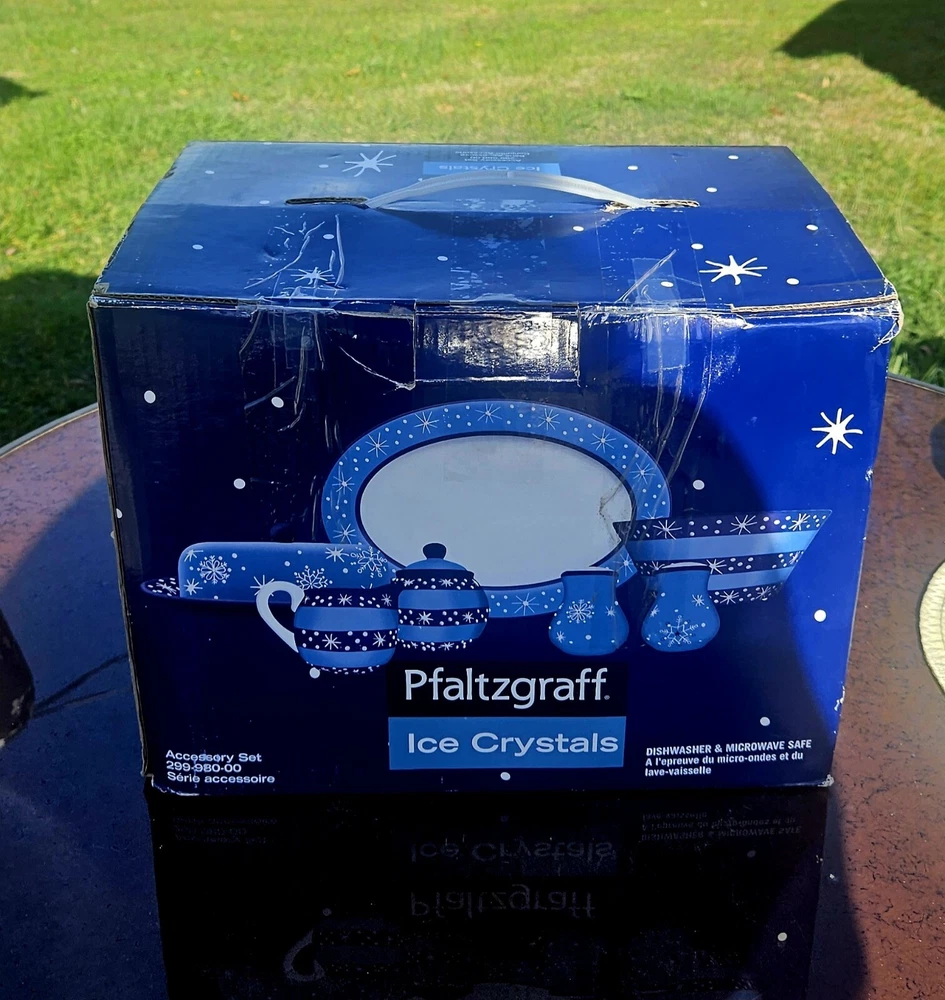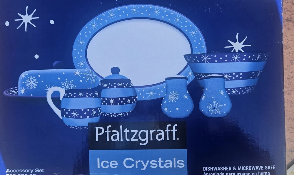 Elevate your holiday table decor with the Pfaltzgraff Ice Crystals Accessory Set. A seamless addition to your seasonal celebrations, this serveware set is crafted from high-quality , capturing the essence of winter with its icy blue hues and white snowflake motif. Designed for adults, the set is a charming choice for those who appreciate the festive spirit of Christmas. Complete and brand new in its original box, the set includes all the pieces needed to add a touch of sophistication to your holiday gatherings. The bundle description denotes a custom collection that is perfect for both intimate family dinners and larger holiday parties. With its elegant design and winter-themed charm, this Pfaltzgraff set is sure to be a conversation starter at any festive event. New , never used condition. Opened outer Box has some wear. Contents have been inspected and are all in new condition. Set includes as pictured : Serving Platter Serving Bowl Salt & Pepper shakers Sugar & Creamer set Covered Butter Dish
