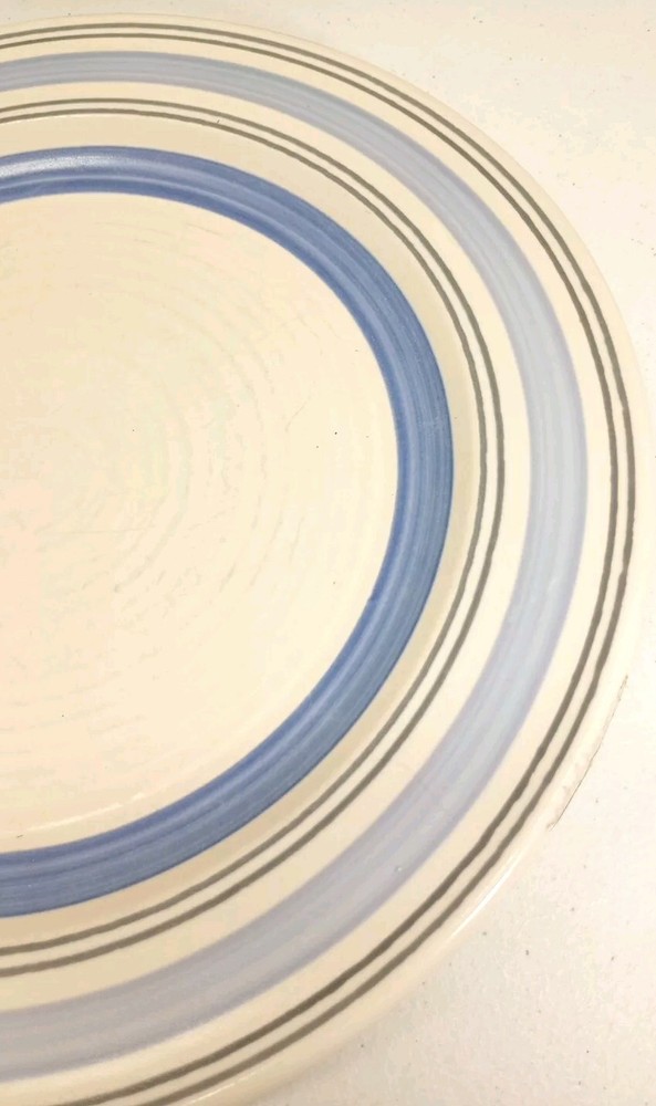 Lot of 3 Pfaltzgraff Rio dinner plates from Mexico. Each plate measures 11" in a round shape with a blue color pattern. They are made of stoneware, featuring hand-painted lines and colors in an original production style. The plates are stackable, microwave and dishwasher safe. The backstamp is printed, and they belong to the Rio product line by Pfaltzgraff. Great for all occasions, these dinner plates add a touch of art pottery to your table setting.