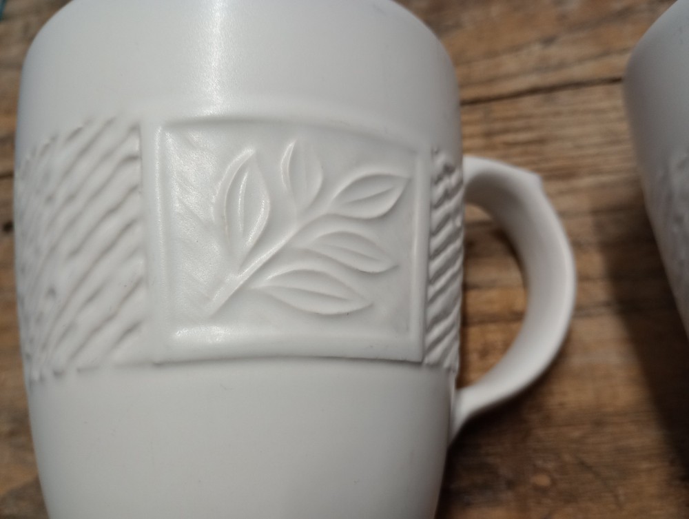 Enjoy your favorite hot beverage with this vintage Pfaltzgraff Sierra mug. Made in the USA, this large 18oz mug features a beautiful botanical pattern that is perfect for any occasion. The off white color and impressed backstamp add to the mug's charm, making it a great addition to any collection. Crafted by Pfaltzgraff, this original Sierra mug has a capacity of 18 oz and measures 4 1/2" x 4 1/2" x 4" wide.inches. It is an ideal piece for all occasions, whether it's for your morning coffee or evening tea. Get your hands on this unique vintage set of 2 mugs today!