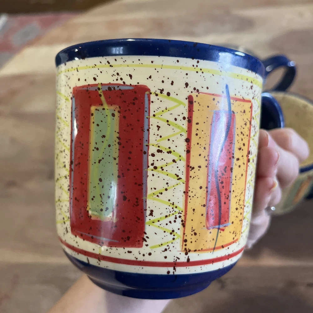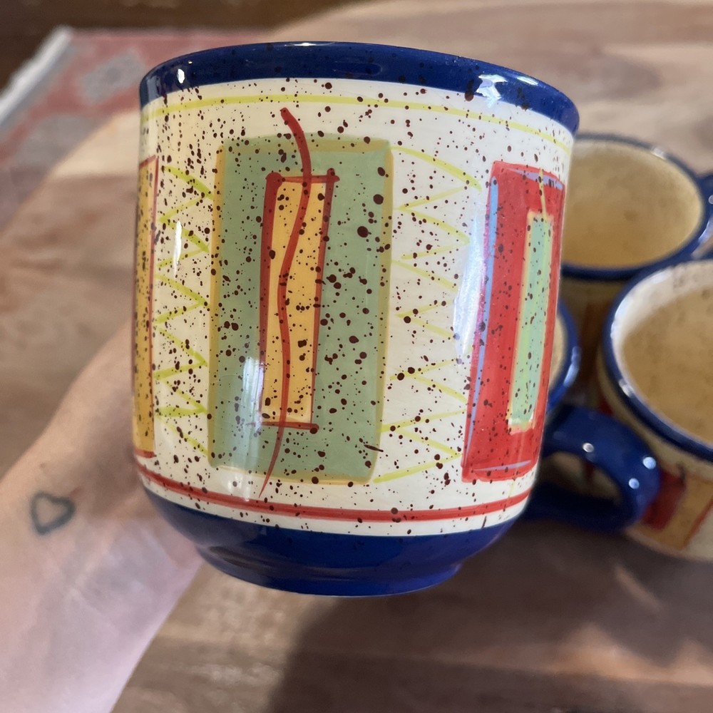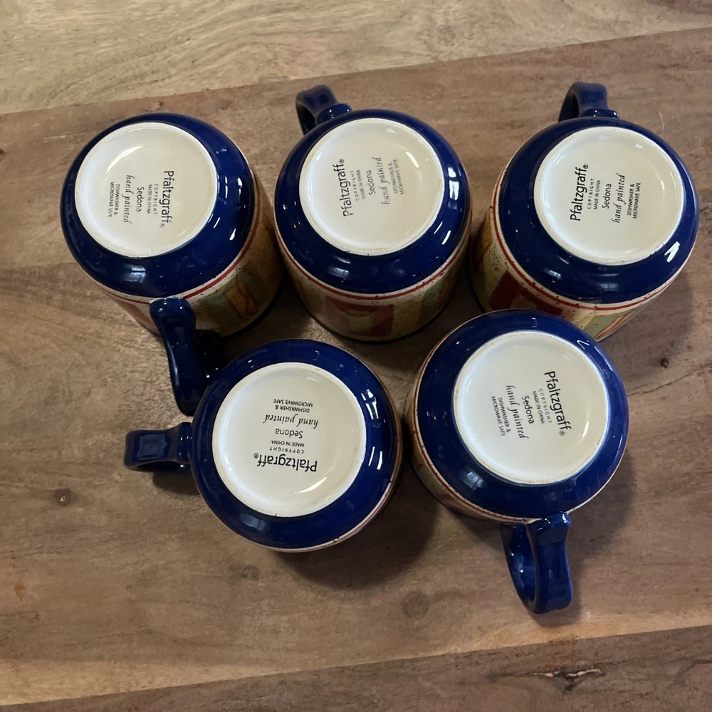 This set of five Pfaltzgraff Sedona stoneware coffee mugs is a great addition to any collection. The mugs feature a round shape and a 16 oz capacity, perfect for enjoying your favorite hot beverage. The multicolor design is hand painted and adds a decorative touch to the mugs. They are stackable, microwave and dishwasher safe and have a glossy finish. These mugs were manufactured in 2009 and are part of the Pfaltzgraff Sedona product line. They are suitable for all occasions and have a Western, Southwest, Aztec, and Color theme. The mugs are 4.25 inches in height and 4 inches in diameter. Care instructions are included and the mugs should be hand washed only. This set is an original and has been printed with a backstamp.