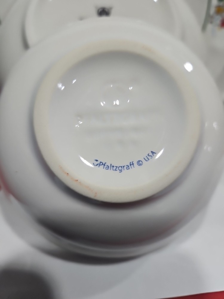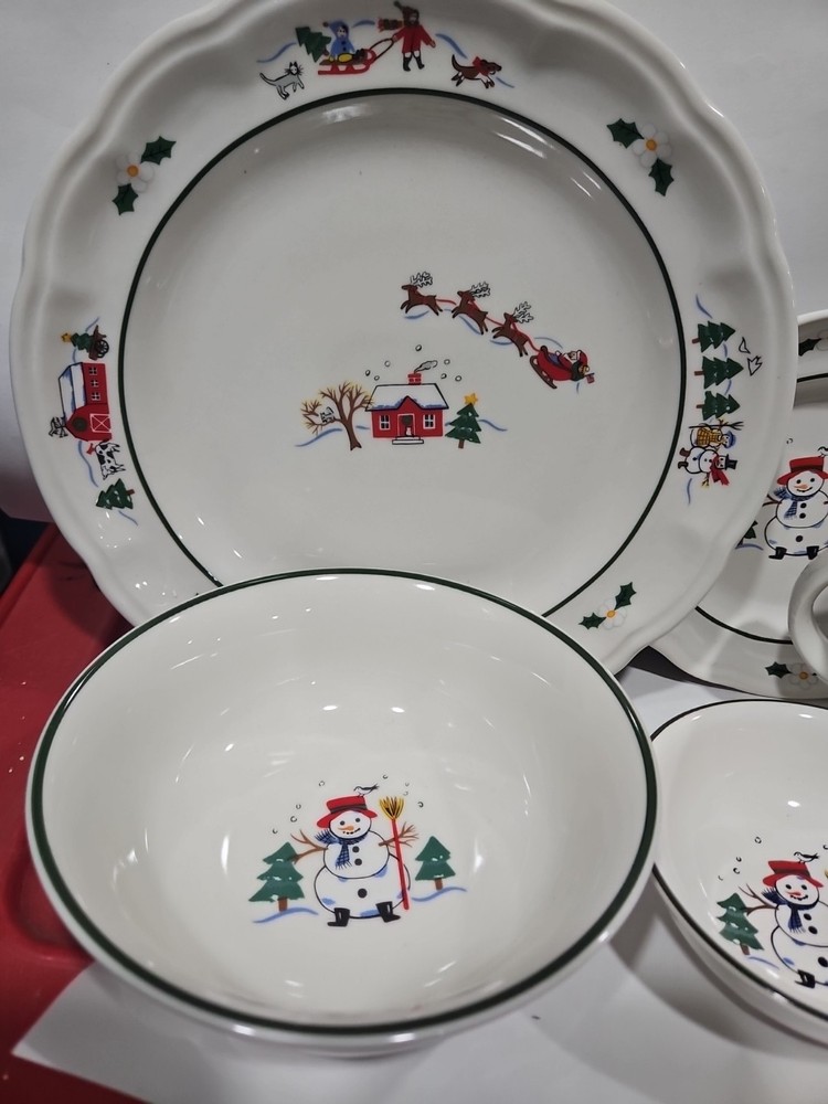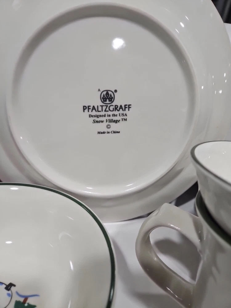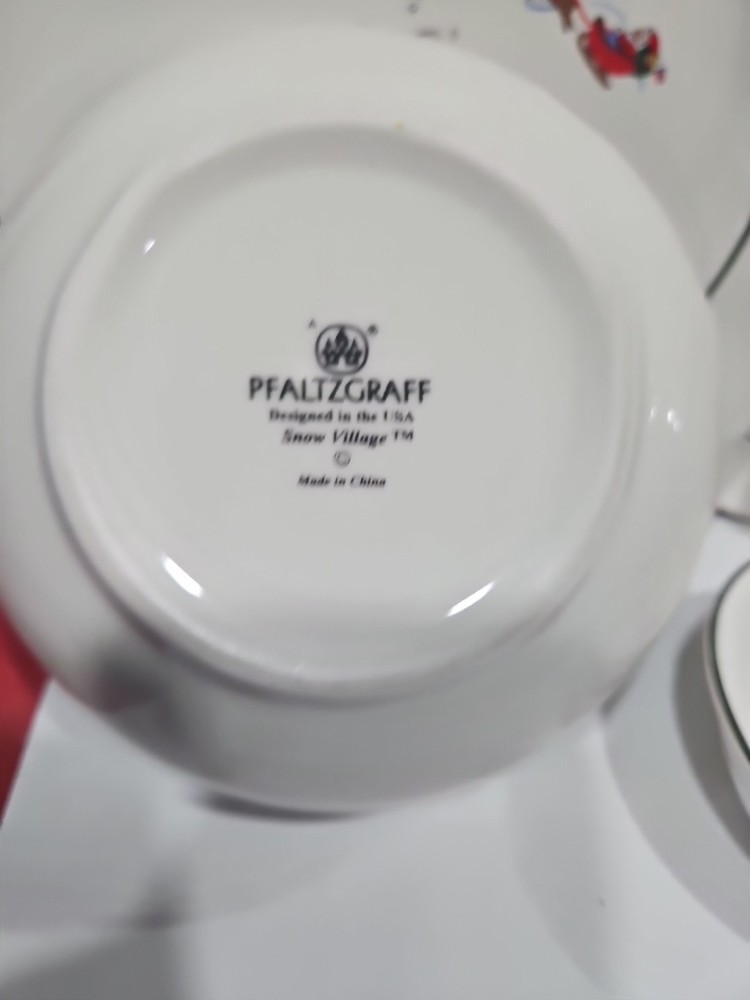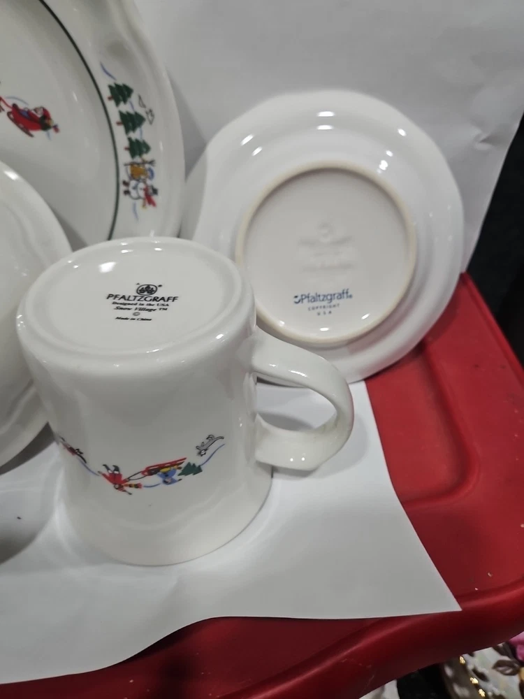 5 miscellaneous pfaltzgraff pieces. All in excellent condition. 4 inch bowl and 6 inch plate are snowman themed with pfaltzgraff stamp on bottom. 9 inch plate, 6inch bowl, and coffee mug all have pfaltzgraff logo and snow village printed on bottom