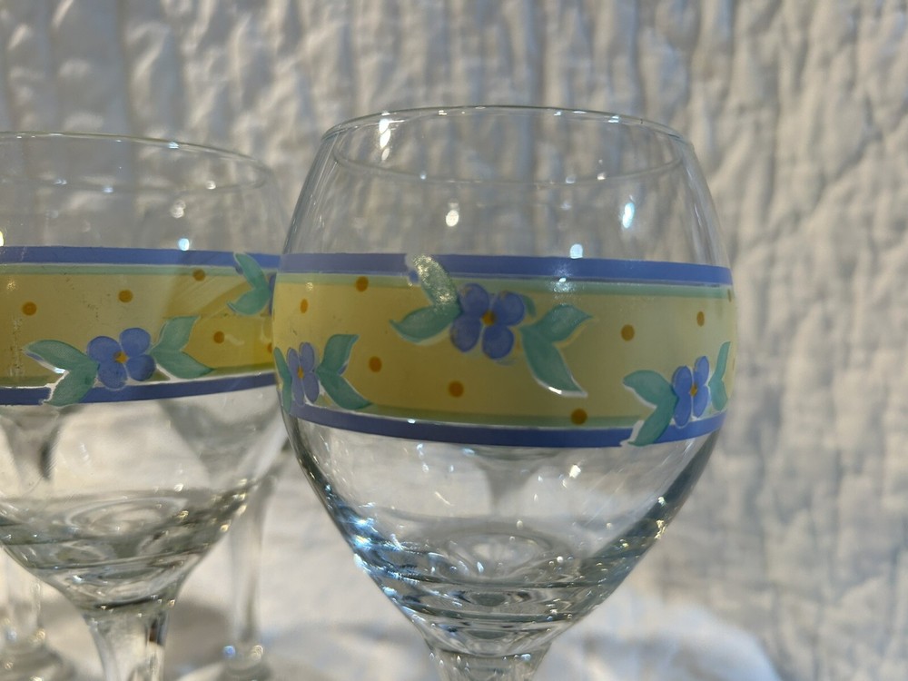 This Pfaltzgraff Summer Breeze wine goblet features a colorful design on glass, standing 7 3/4 inches tall and 2 3/4 inches wide. With a 10 oz capacity, this goblet is suitable for all occasions, adorned with a decorative pattern making it a stylish choice for drinkware and barware collections. Set of eight (8) Goblets
