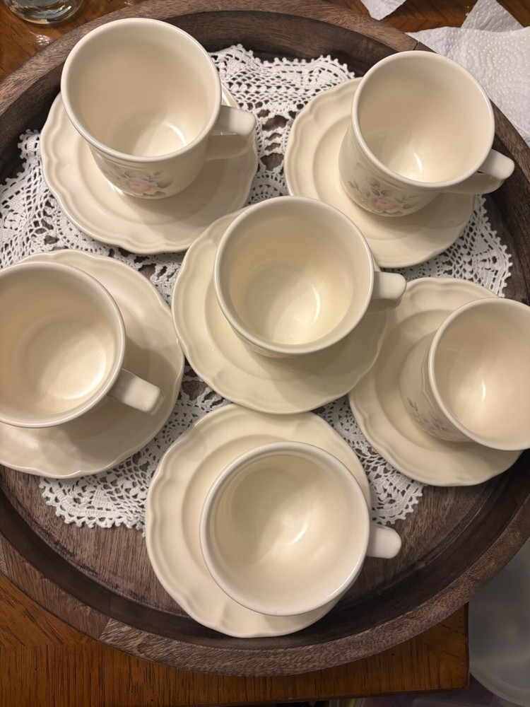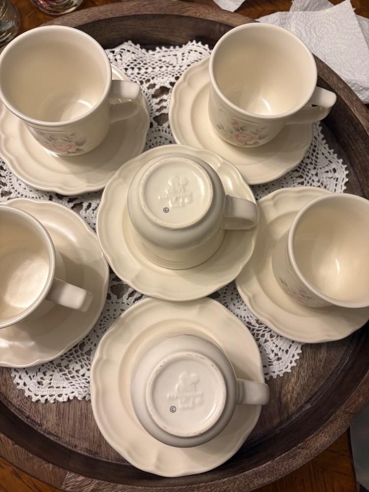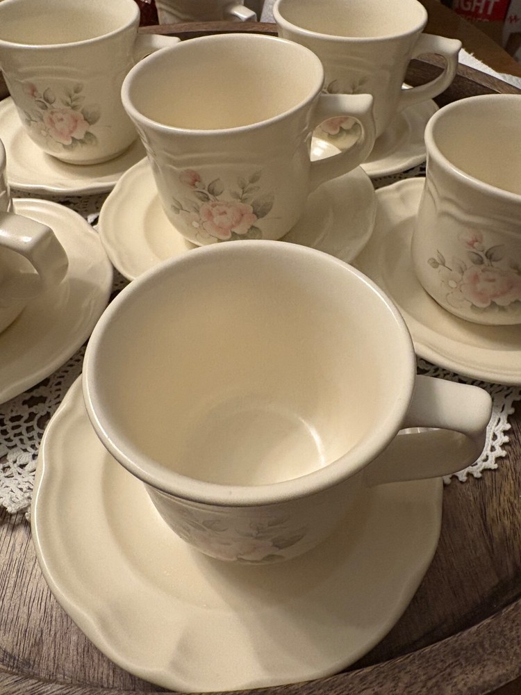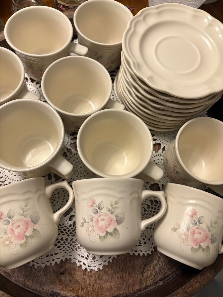 The Pfaltzgraff Tea Rose Pattern Set of 10 Cups and Saucers Stoneware is a charming and elegant collection featuring a floral Tea Rose design in pink flowers. Made of durable stoneware, these round mugs are perfect for serving coffee or tea. With a handle for easy gripping and suitable for hot beverages, this original Pfaltzgraff set is an ideal addition to any coffee or tea lover's collection. Made in the United States, these mugs showcase a floral theme and style, adding a touch of vintage charm to your kitchen decor.