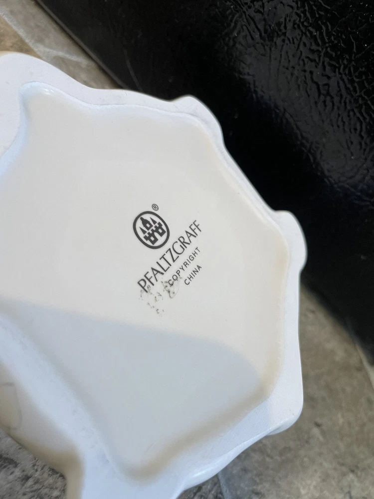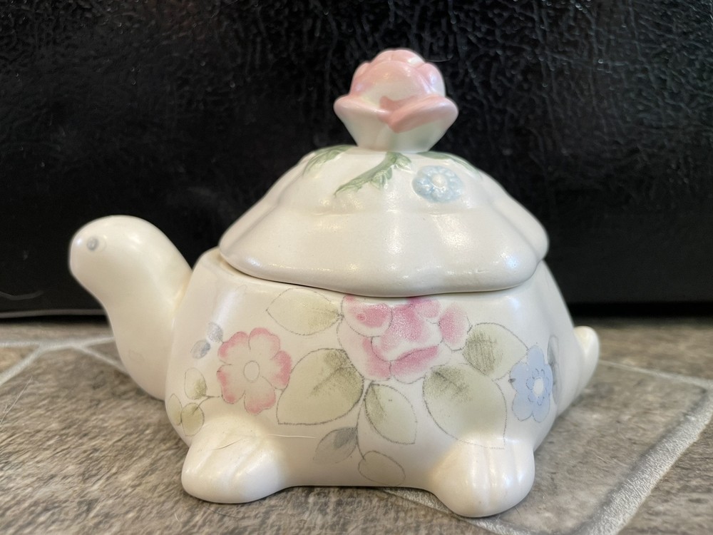 This is a Pfaltzgraff Tea Rose turtle candle with lid. It is white with a pink, blue, and green floral design. It measures 5 1/4" x 4" and is 3" tall. Very nice. There is a small chip on the back of the lid near the rim. 257K