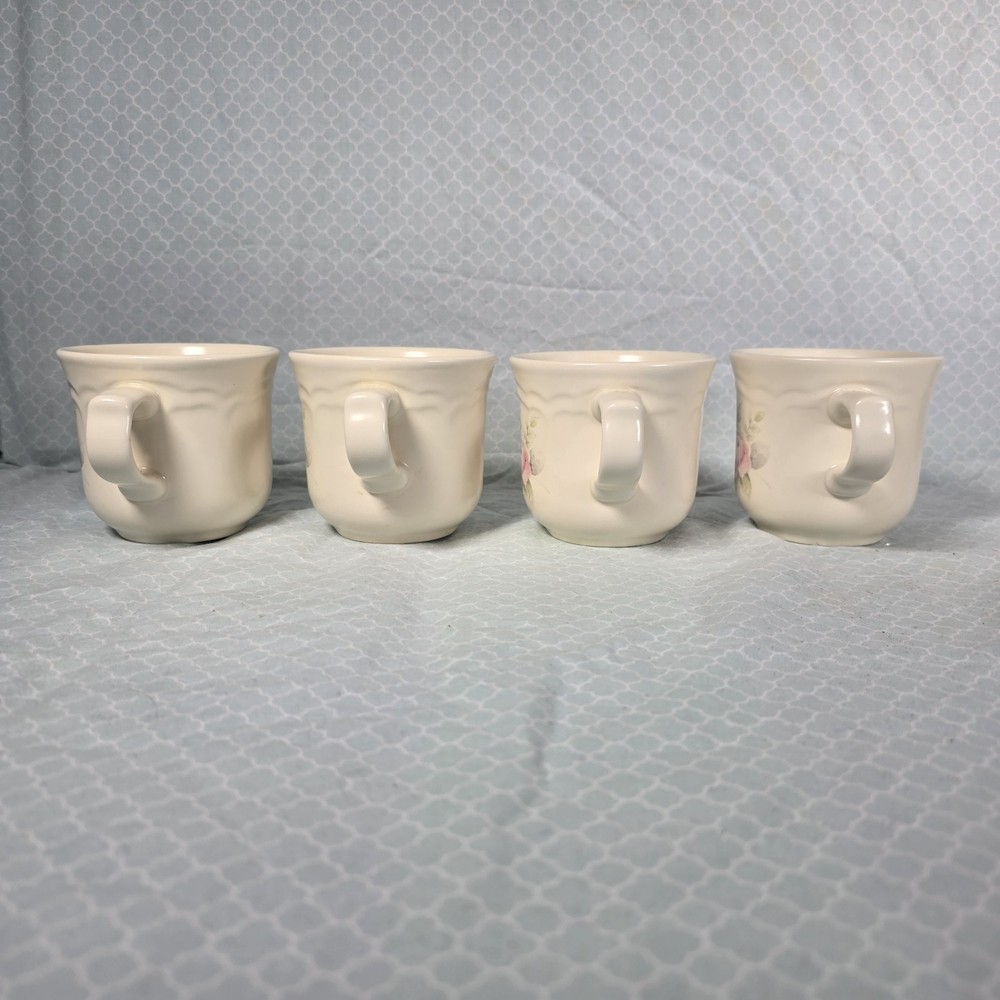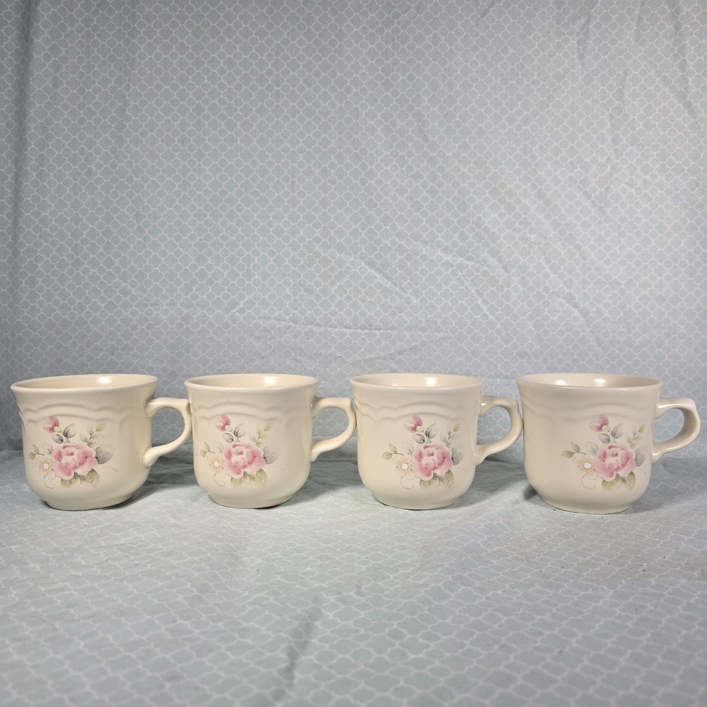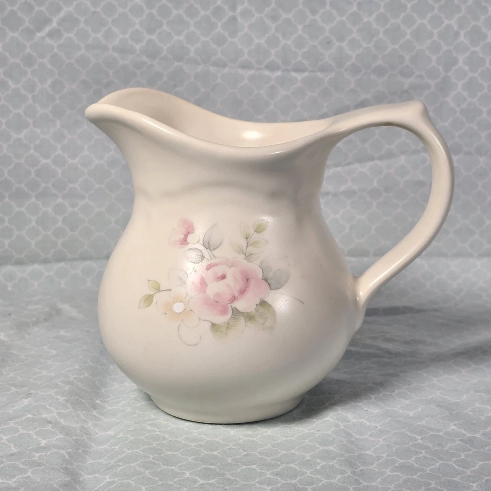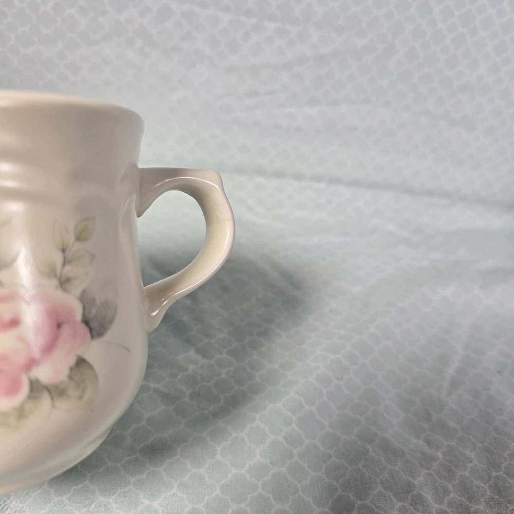 The Pfaltzgraff Tea Rose eight-piece set includes seven mugs and a creamer, all made of pink flower-patterned stoneware. This original United States-made collection features a round shape with handles, ideal for serving hot beverages. The Tea Rose design adds a floral touch to your table setting. See photos for exact condition. There is a small crack on the handle of one of the mugs. It is pictured. No other flaws are present.