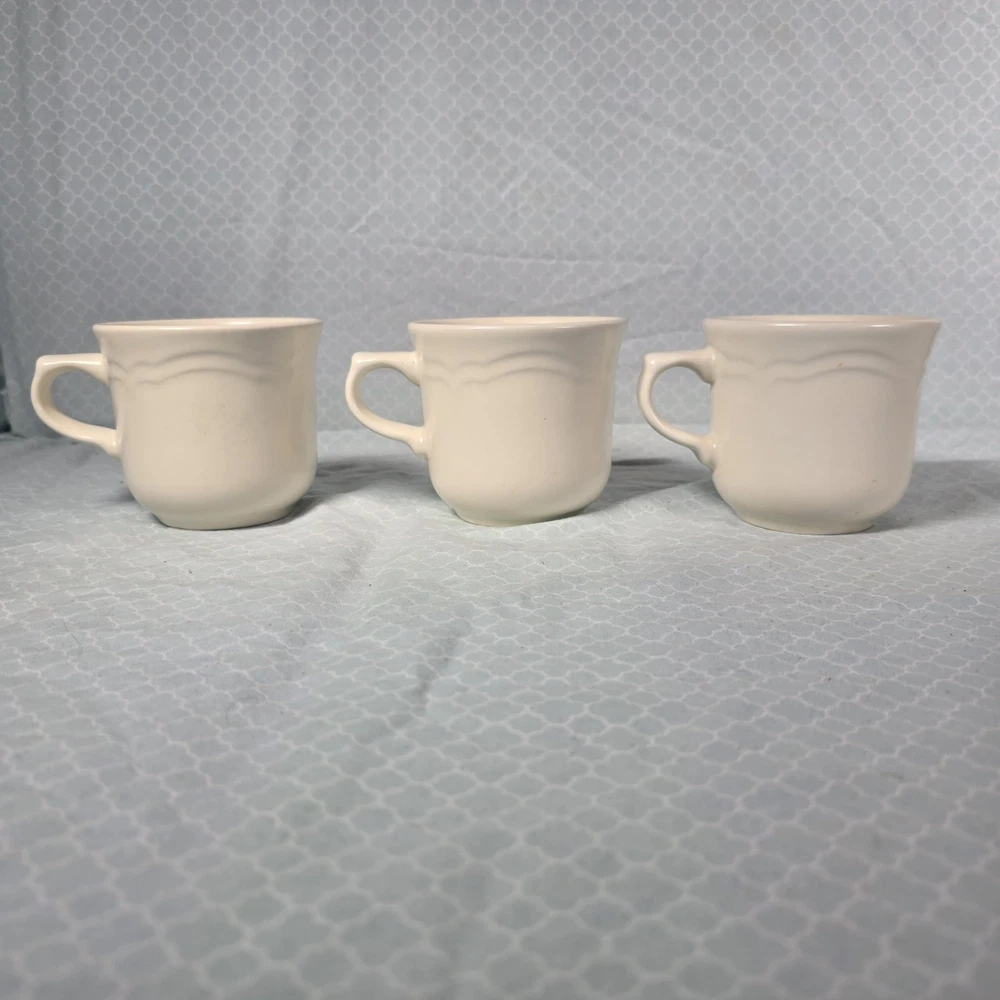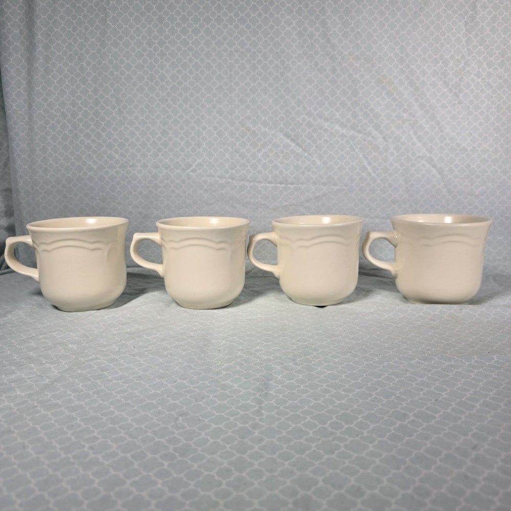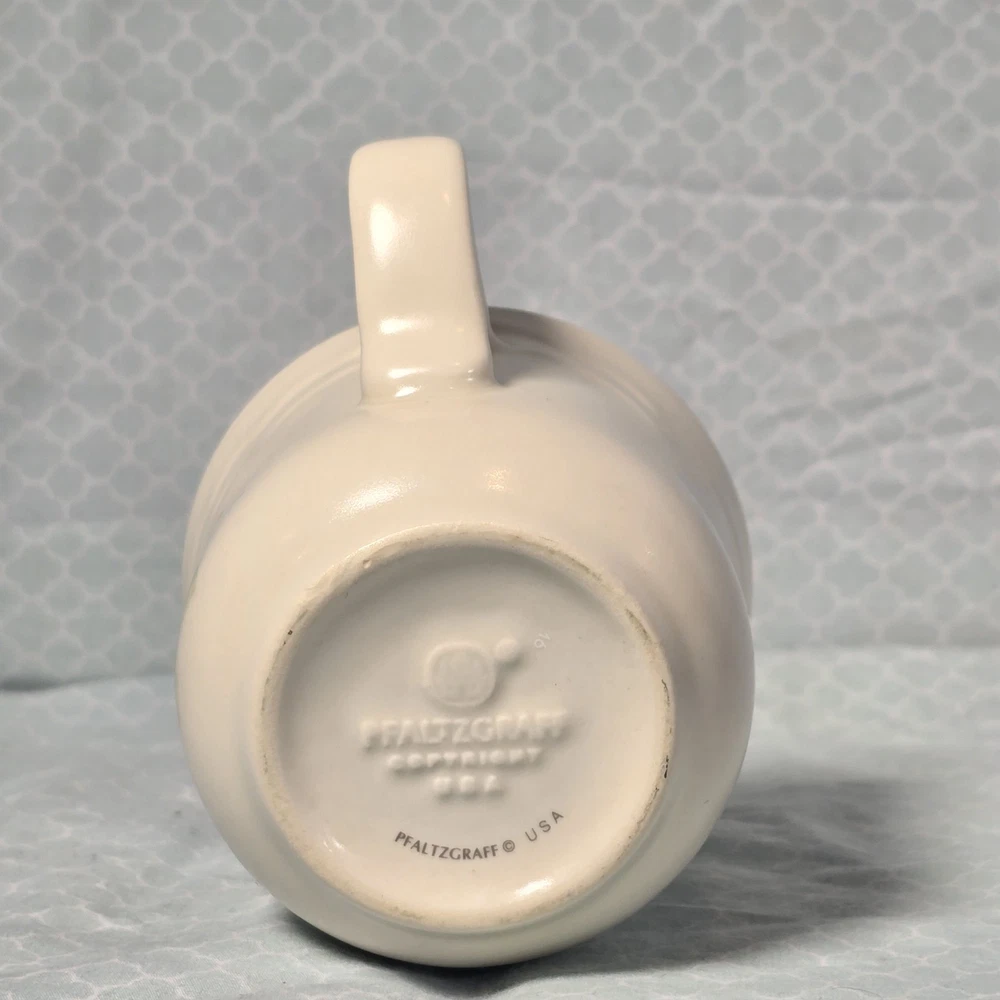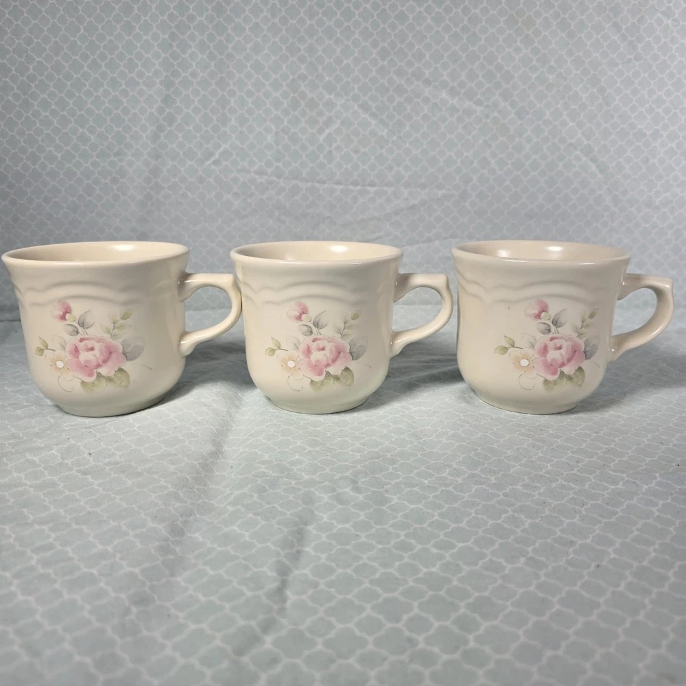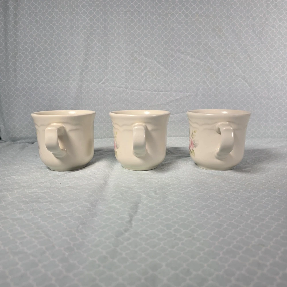 The Pfaltzgraff Tea Rose eight-piece set includes seven mugs and a creamer, all made of pink flower-patterned stoneware. This original United States-made collection features a round shape with handles, ideal for serving hot beverages. The Tea Rose design adds a floral touch to your table setting. See photos for exact condition. There is a small crack on the handle of one of the mugs. It is pictured. No other flaws are present.