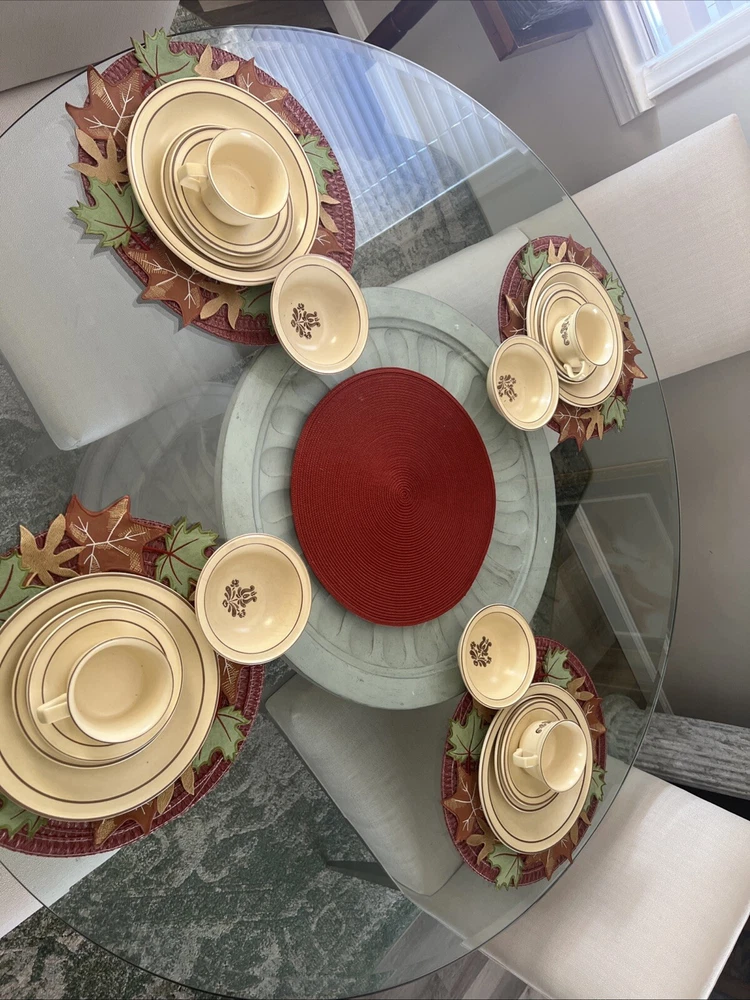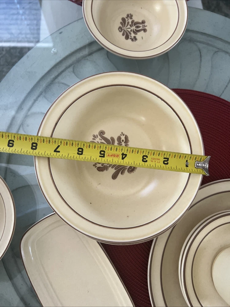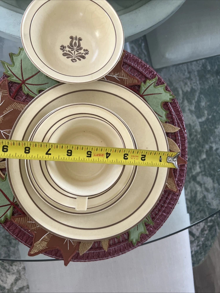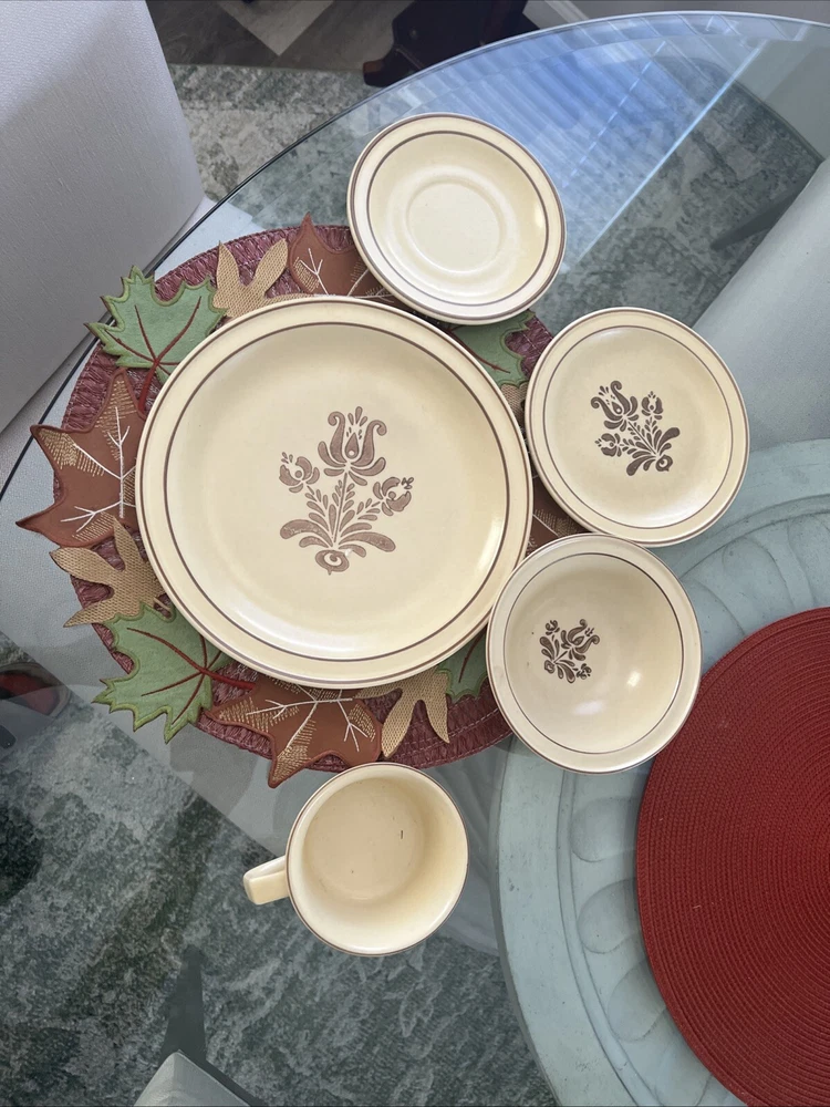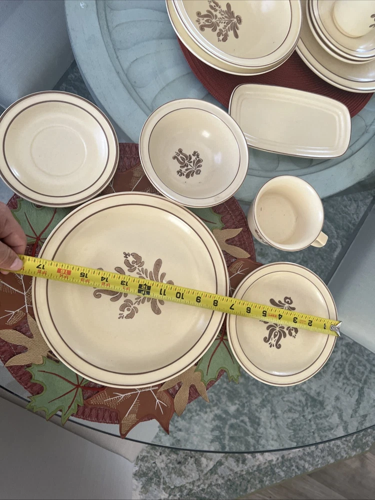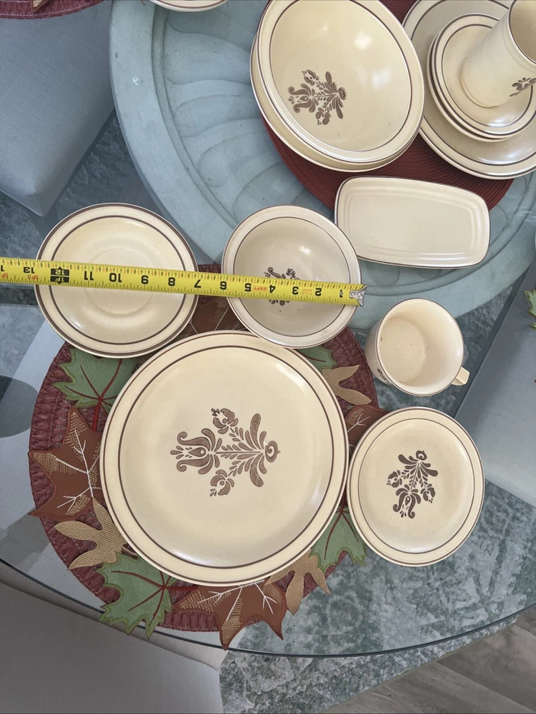 The Pfaltzgraff Village Dinnerware set includes 31 pieces in total, featuring a vintage design in beige stoneware. The set consists of 4 full place settings and additional plates. Perfect for serving meals or desserts, this charming set is a classic addition to any dining table. Look at the pictures and ask questions before making your purchase