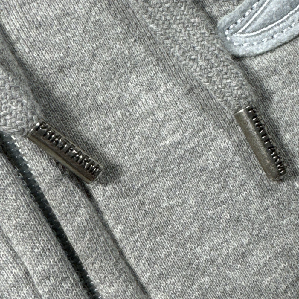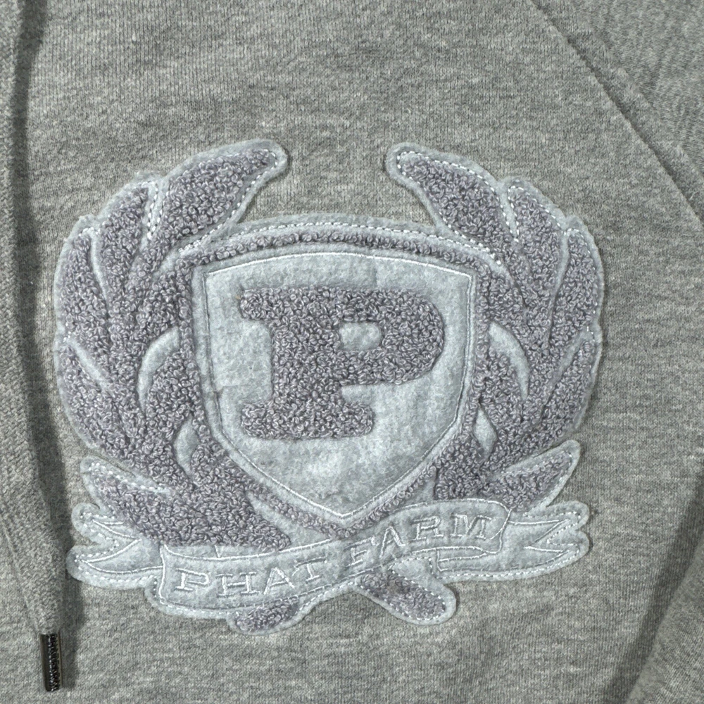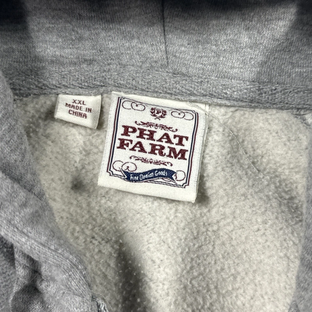 Elevate your street style with this Phat Farm Men's XXL Gray Zip Up Hoodie. This Y2K vintage hoodie features a full zip closure and a trendy gray color that will complement any outfit. The hoodie is made from high-quality materials to ensure durability and comfort. Perfect for men who want to add a touch of style to their wardrobe, this hoodie is suitable for any occasion. Whether you're running errands or hanging out with friends, this hoodie will keep you warm and comfortable. Don't miss out on this must-have addition to your wardrobe.