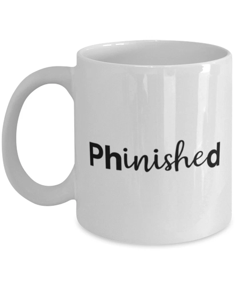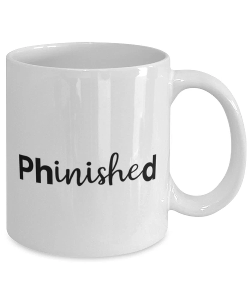 Phd Graduation Funny Coffee Mug Phinished Phd Graduation Gift Phd Graduate Mug Product Details.. This high quality 11oz. ceramic white mug has a premium hard coat that provides crisp and vibrant color reproduction sure to last for years. Perfect for all hot & cold beverages. The highest quality printing possible is used. It will never fade no matter how many times you wash it. Material: 100% Ceramic. Print both sides. Dishwasher and Microwave Safe. High Gloss + Premium White Finish. Printed in the U.S.A. Personalized & Custom. We support personalized and custom mug to add custom, when placing an order, you can add notes to the "order note" in shipping address section. Also you can contact us directly via message. Shipping Info. Ready to ship in 1 to 2 business days, All products are made-to-order and proudly printed in the United States. Shipped by USPS and DHL, You will receive your order in 5-7 days. Replace & Refund. All products are defective during shipping broken, chipped will be replaced free of charge. You are not satisfied with the product, we will refund 100% money to you. If any other issues arise, please do not hesitate to message, we would be more than happy to assist you.