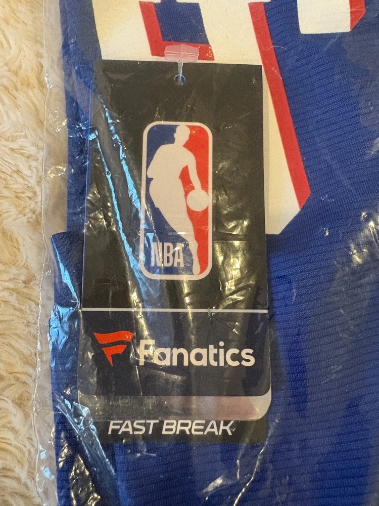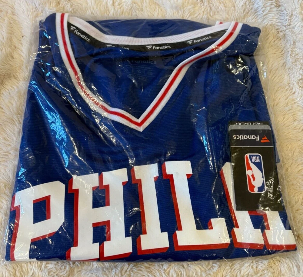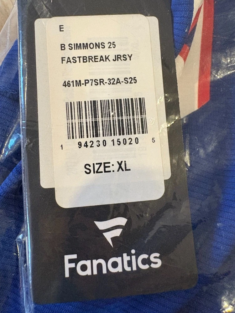 The product is a men's XL Philadelphia 76ers Ben Simmons Fanatics Fast Break Replica Jersey in royal blue. It is officially licensed by the National Basketball Association (NBA) and features multi-color detailing. Perfect for basketball fans wanting to support the Philadelphia 76ers during the regular season.