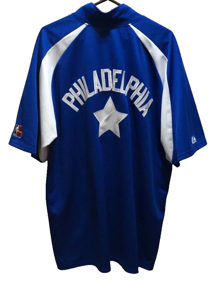 Vintage 90s NBA Official Licensed Product Majestic Hardwood Classics Philadelphia 76ers Pullover Pre-Game Warmup / Shooting Shirt *100% Polyester *Embroidered / Sewn / Stitched *Color: Red / Blue / White *Size: XL Approximately Measurements: *Armpit to Armpit 27" *Shoulder to Hemline 36" *Shoulder to Shoulder Condition: Pre-owned.