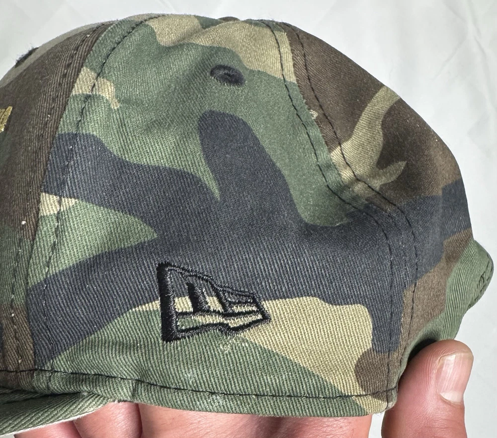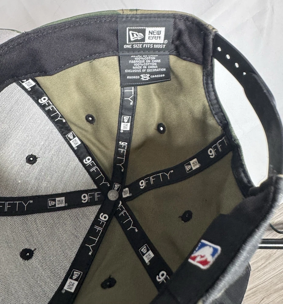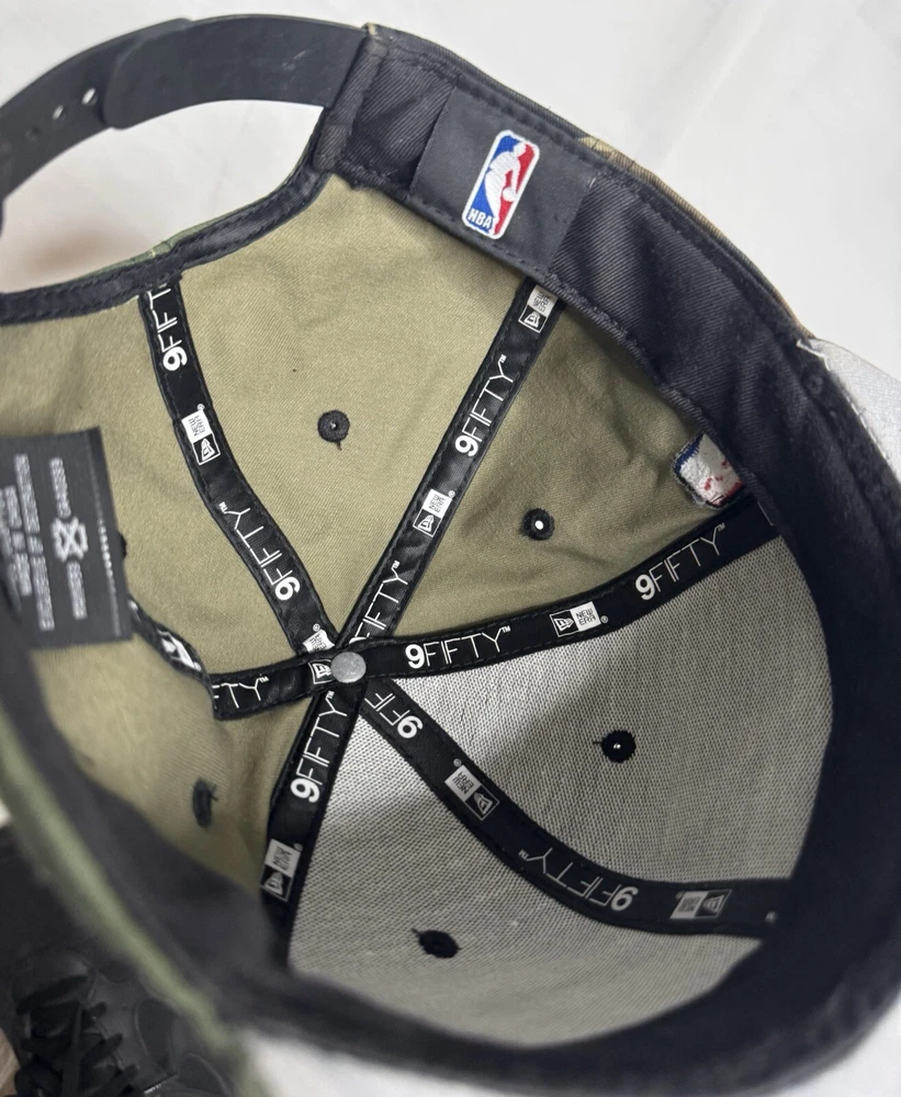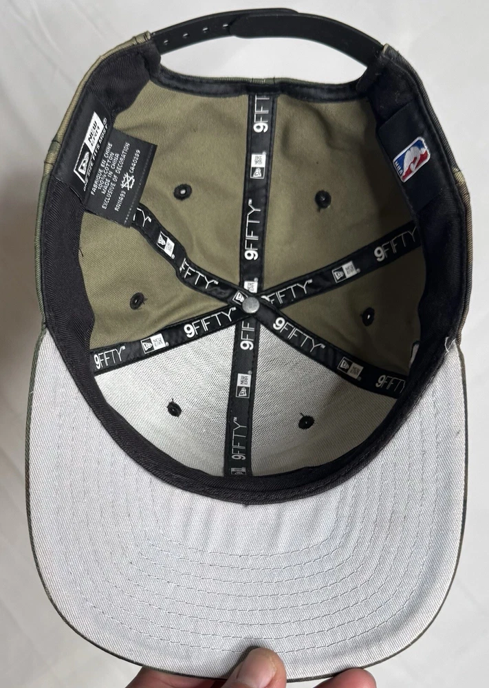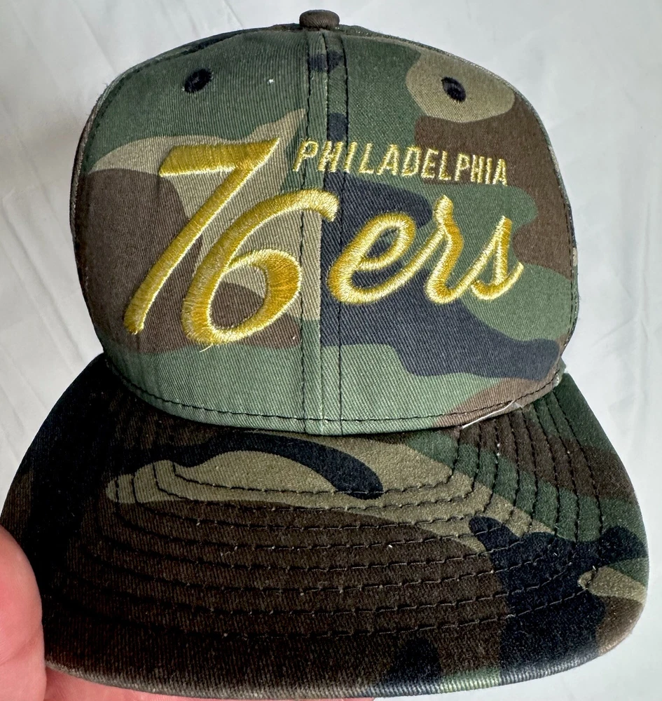 Philadelphia 76ers New Era Snap Back Hat NBA Camo Gold Hat is used. Looks and cleanliness is 9.5/10 Normal wear & tear, and little grooves