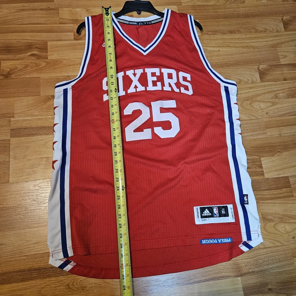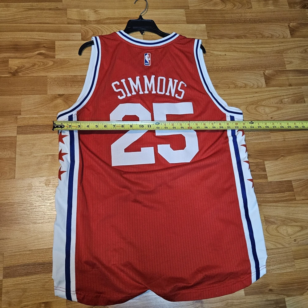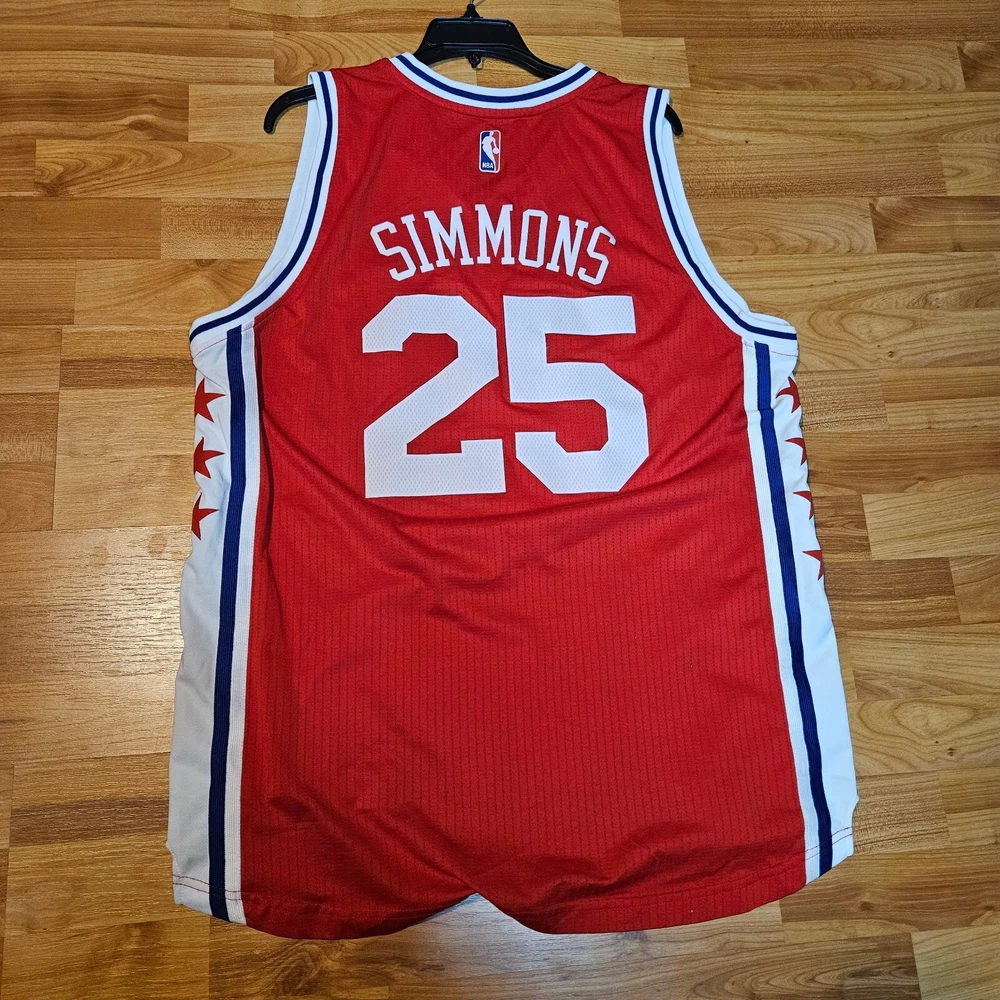 Show off your love for the Philadelphia 76ers with this vintage Adidas Ben Simmons jersey. The red jersey is size XL and features the team's name and Simmons' name printed across the front. This is a must-have for any basketball fan and collector. The jersey is in great condition and is perfect for wearing to games or displaying in your fan cave. Add it to your collection today!