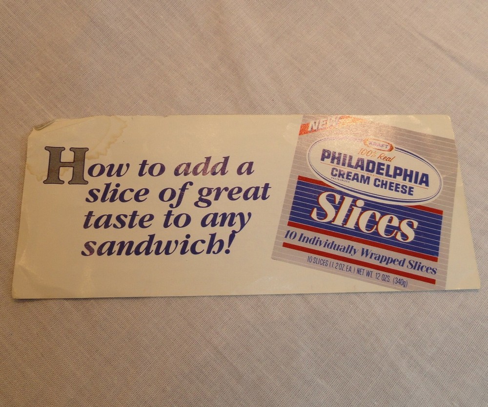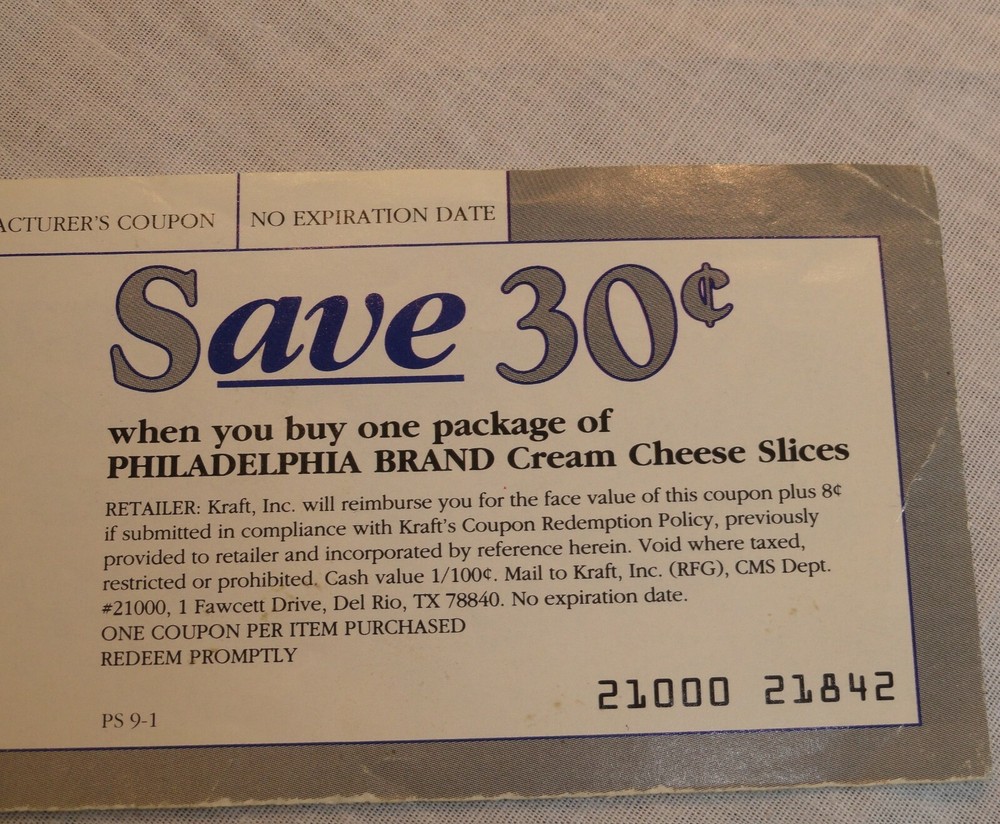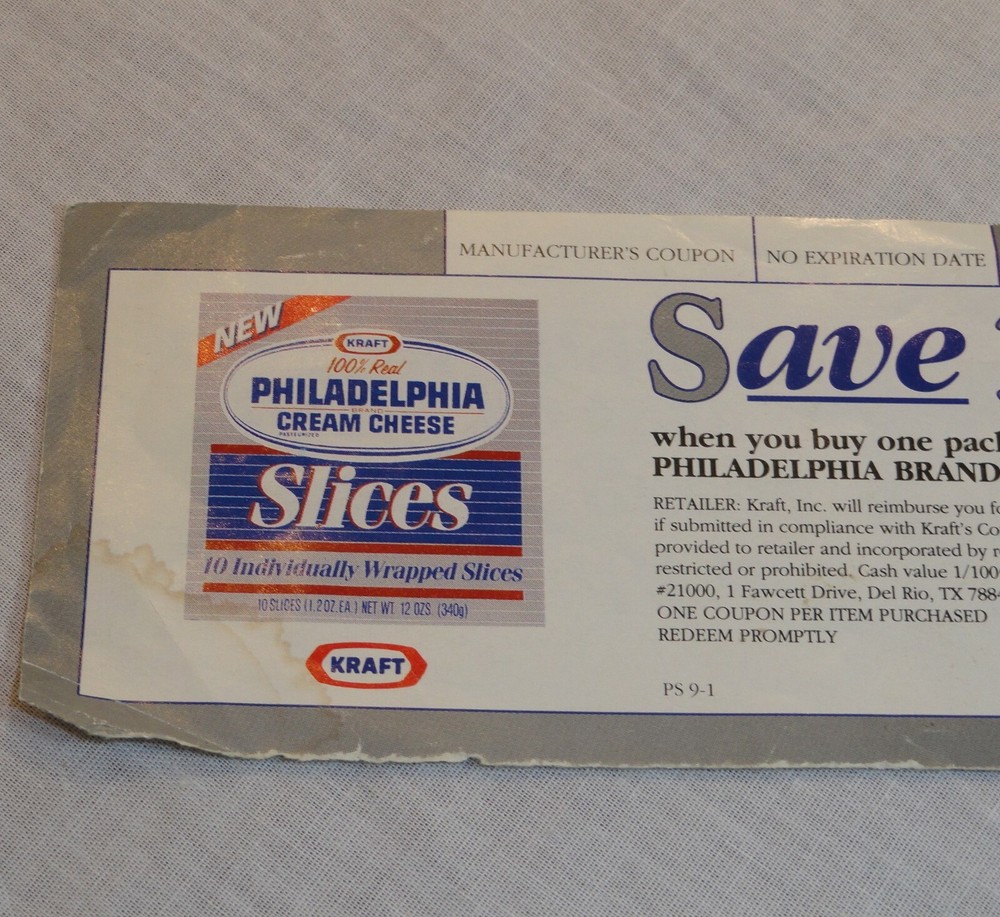Coupon for 100% Real Philadelphia Cream Cheese Slices Coupon Value is 30 Cents Manufacturer's Coupon No Expiration Original Coupon in Color Seems To Be Obsolete Since This Product is No Longer Available in the U.S. Great For Coupon Collections Get Your Collector's Copy Today!