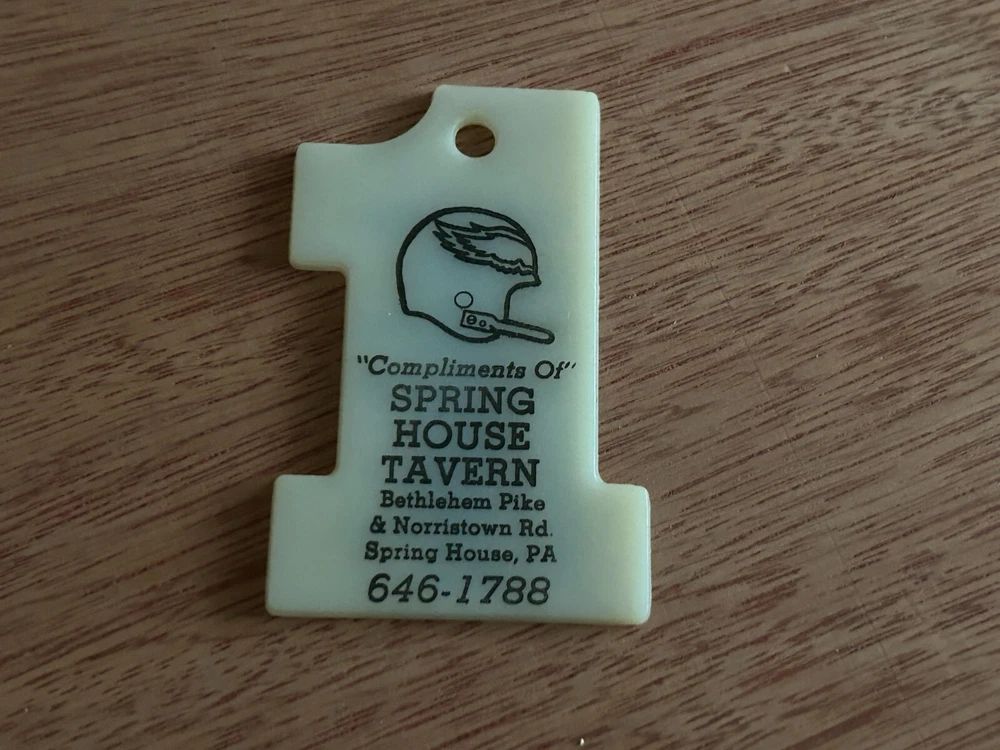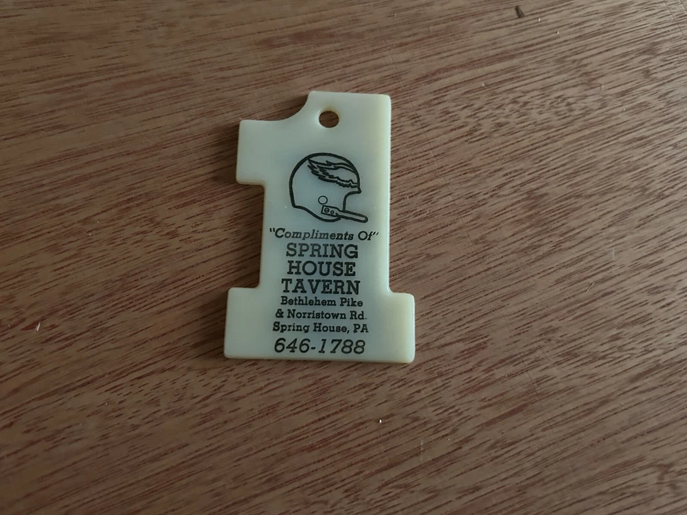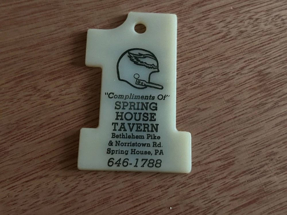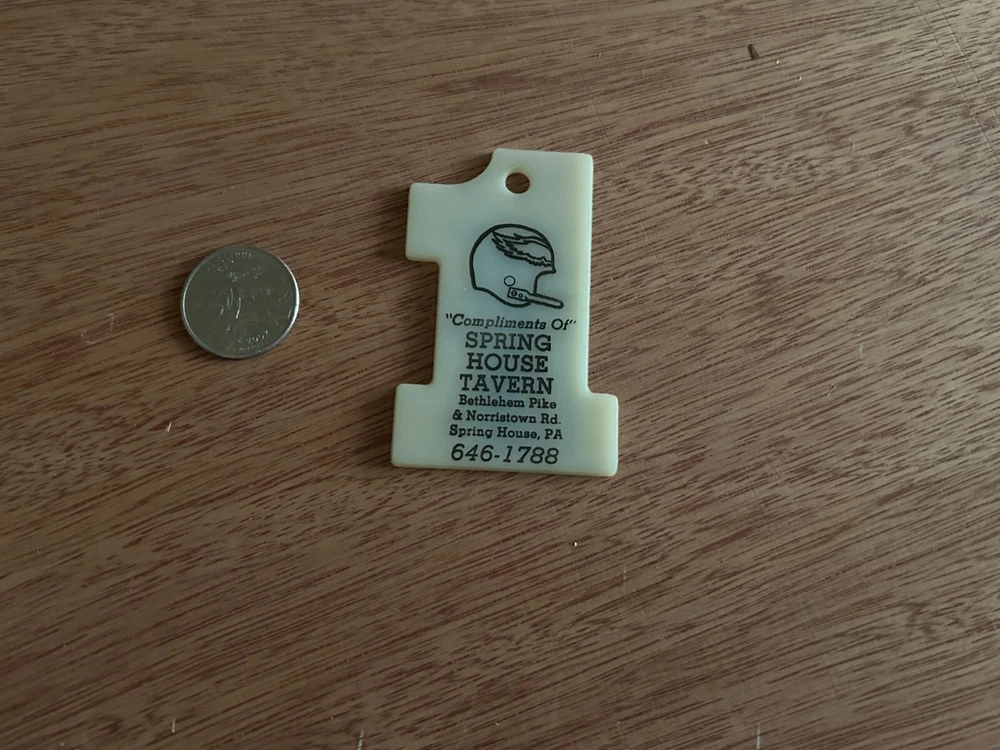 Features: Philadelphia Eagles Schedule, Advertising subject: Philadelphia Eagles, Spring House Tavern type: fob from a keychain year: 1982 Era: Modern (1970-Now) is the chain included?: NO - IT IS MISSING ITS CHAIN Material: Plastic Theme: advertising, football Country/Region of Manufacture: Unknown Color: see pictures Character Family: advertising