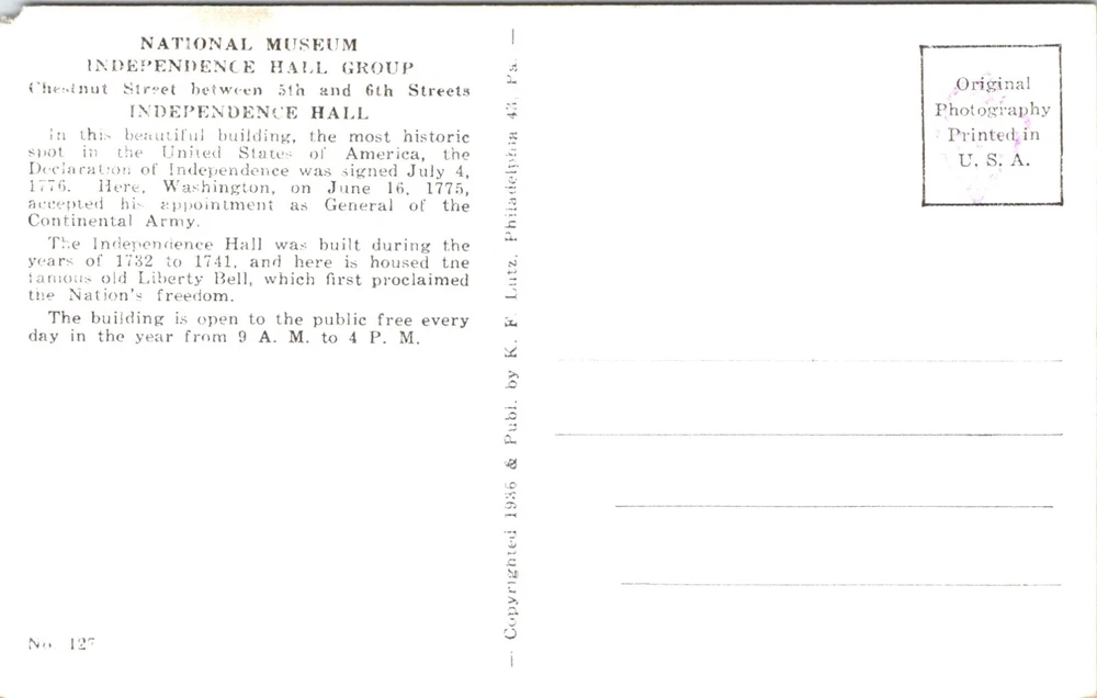 Philadelphia Pennsylvania Independence Hall Commodore Barry RPPC Postcard 16668 Front of Card: The image is a vintage photograph of Independence Hall and the Commodore Barry Monument in Philadelphia. The photograph captures the front facade of Independence Hall, a historic building with a prominent clock tower. In front of the building, there is a statue of Commodore Barry, with the name "BARRY" inscribed on the pedestal. The image also includes a street lamp on the left and an American flag on the right. The trees in the image are bare, suggesting it was taken in winter or early spring. The photograph is labeled with the text "Philadelphia" at the bottom left and "Independence Hall and Commodore Barry Monument" at the bottom right, along with the photographer's name "K.F. Lutz." Back of Card: The image shows the back of a postcard from the National Museum Independence Hall Group. The postcard contains a detailed description of Independence Hall, located on Chestnut Street between 5th and 6th Streets. The text highlights the historical significance of the building, noting that it is the site where the Declaration of Independence was signed on July 4, 1776, and where George Washington accepted his appointment as General of the Continental Army on June 16, 1775. The building, constructed between 1732 and 1741, houses the famous Liberty Bell, which first proclaimed the nation's freedom. The postcard also mentions that the building is open to the public free of charge every day of the year from 9 A.M. to 4 P.M. The right side of the postcard has space for a message, address, and stamp, with a note indicating that the original photography was printed in the U.S.A. The postcard is copyrighted in 1936 by K. F. Lutz, Philadelphia, Pa. Transcription of the text on the postcard: **NATIONAL MUSEUM INDEPENDENCE HALL GROUP Chestnut Street between 5th and 6th Streets INDEPENDENCE HALL** *In this beautiful building, the most historic spot in the United States of America, the Declaration of Independence was signed July 4, 1776. Here, Washington, on June 16, 1775, accepted his appointment as General of the Continental Army.* *The Independence Hall was built during the years of 1732 to 1741, and here is housed the famous old Liberty Bell, which first proclaimed the Nation's freedom.* *The building is open to the public free every day in the year from 9 A.M. to 4 P.M.* **No. 127** *Original Photography Printed in U.S.A.* *Copyrighted 1936 & Publ. by K. F. Lutz, Philadelphia, Pa.*