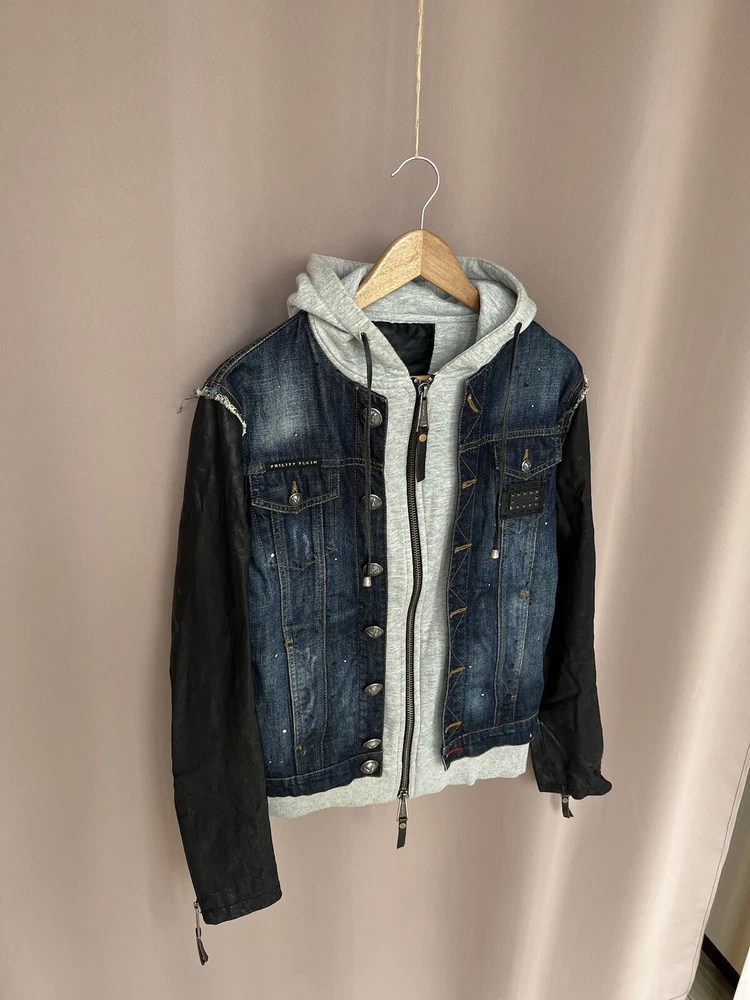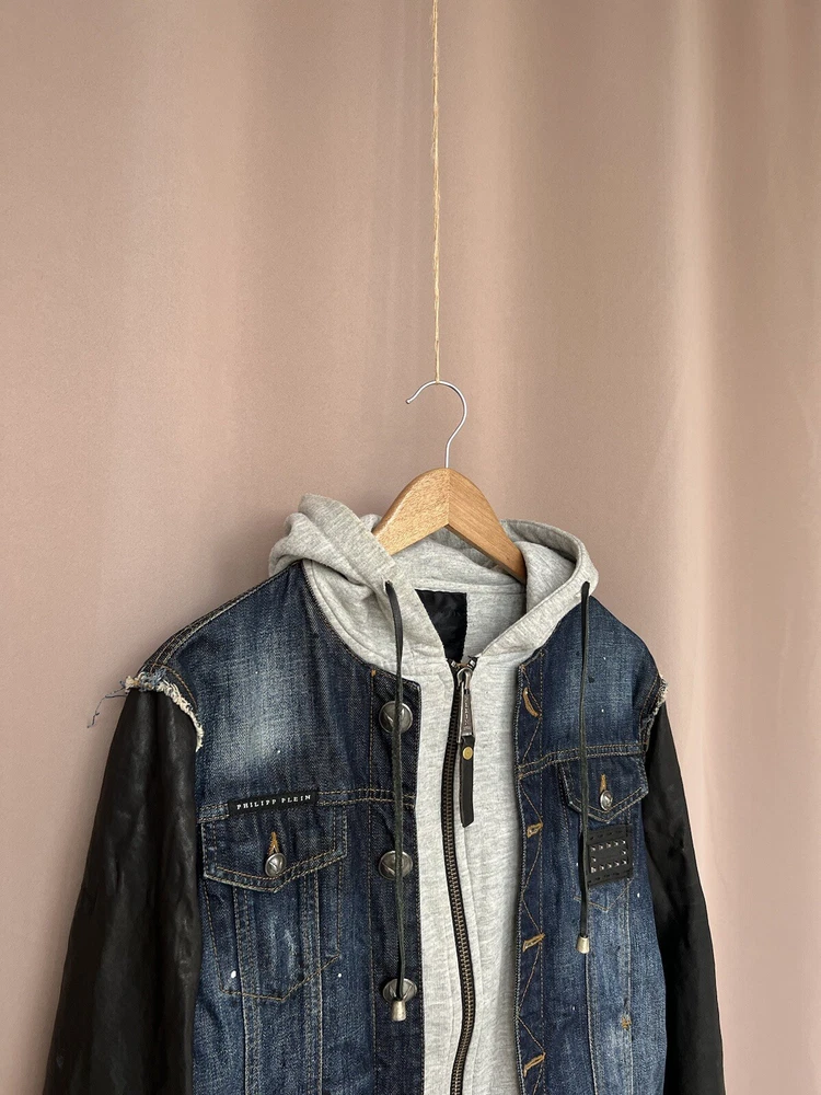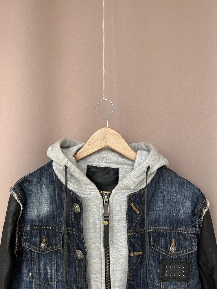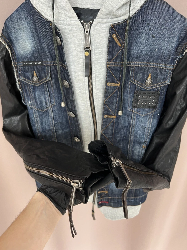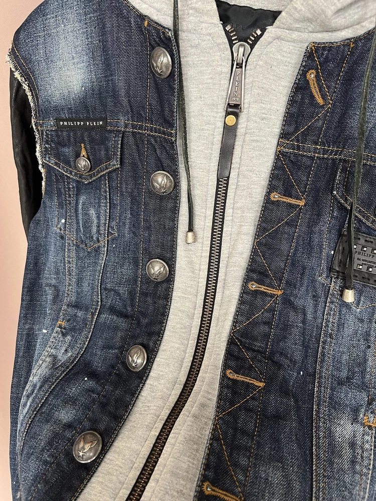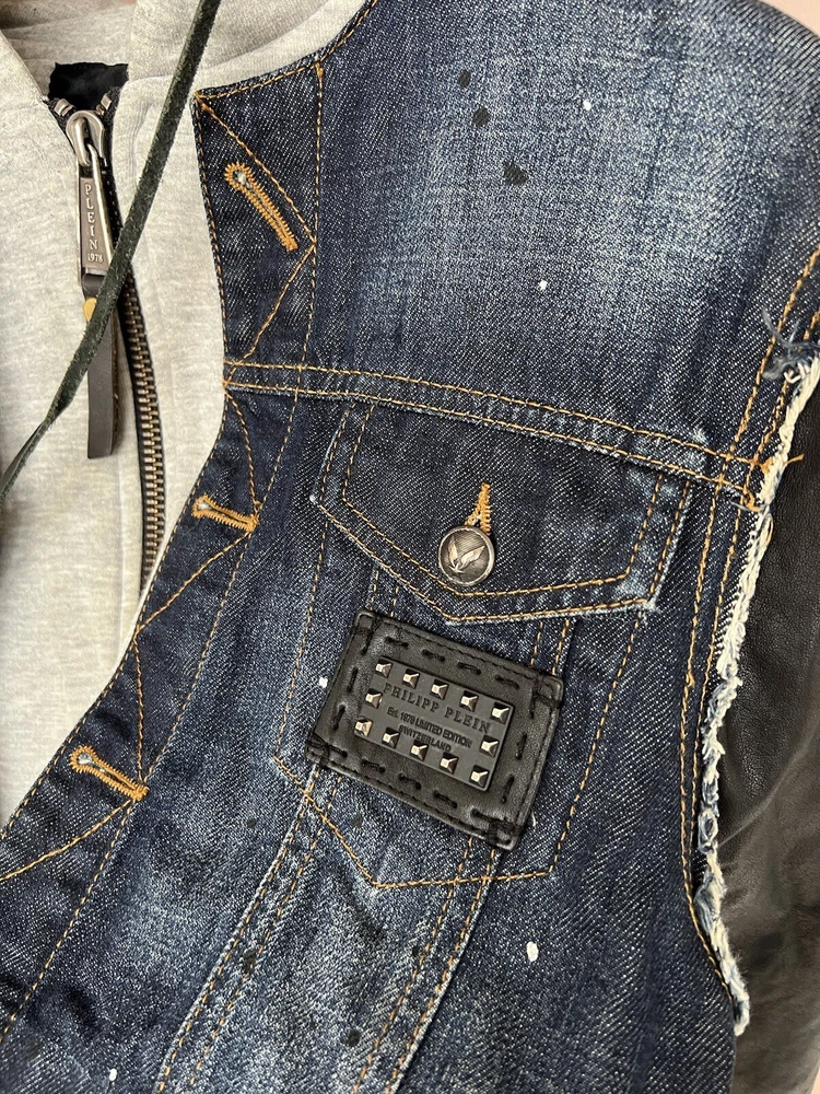 Philipp Plein Denim Hooded Blue Jacket Mens Size M Black Leather Sleeves