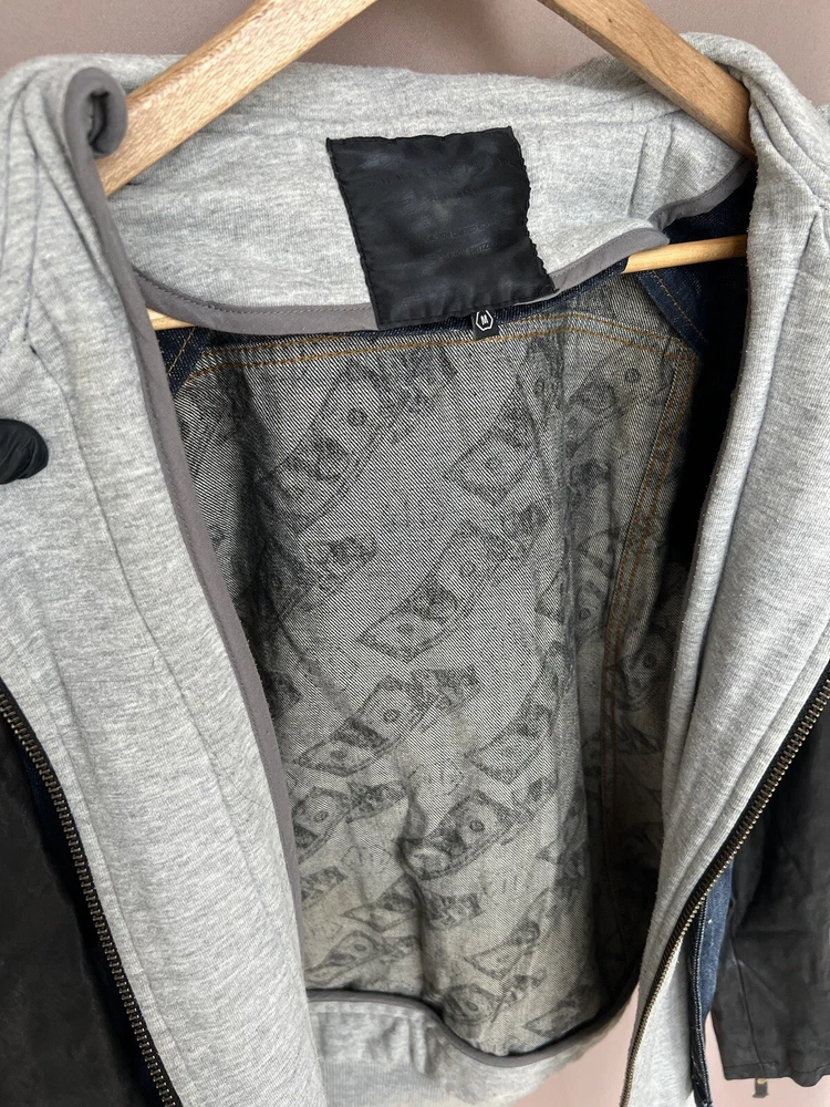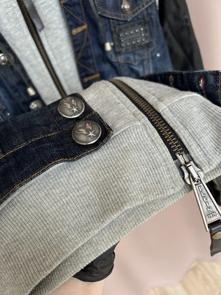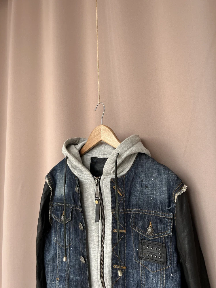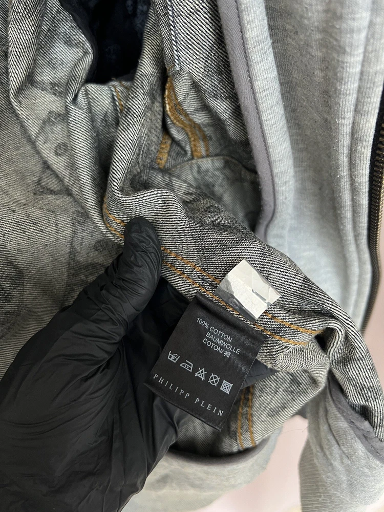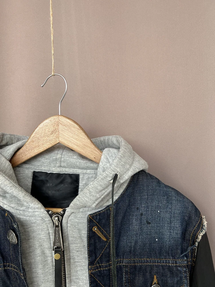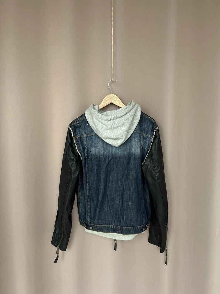 Philipp Plein Denim Hooded Blue Jacket Mens Size M Black Leather Sleeves