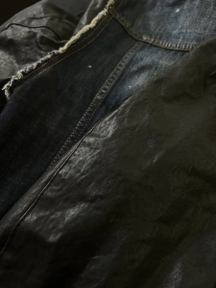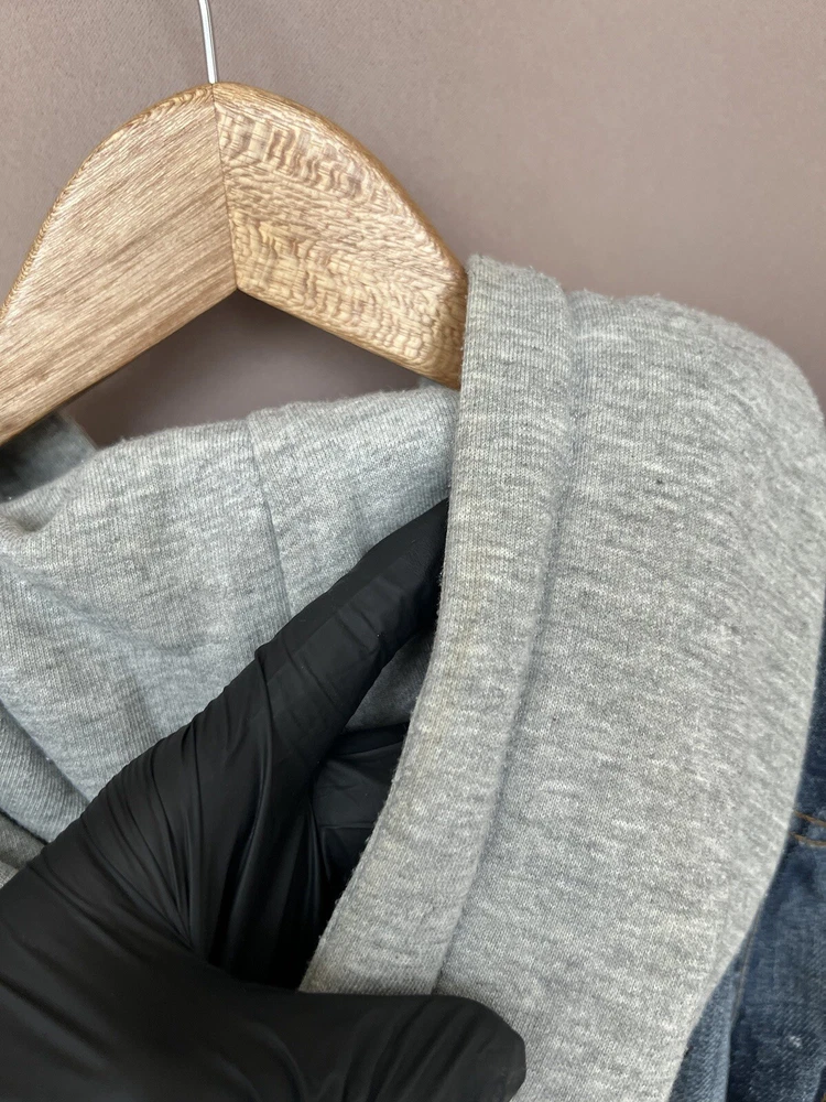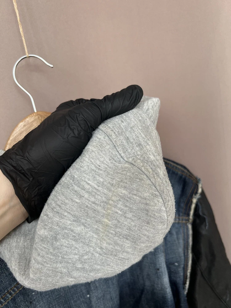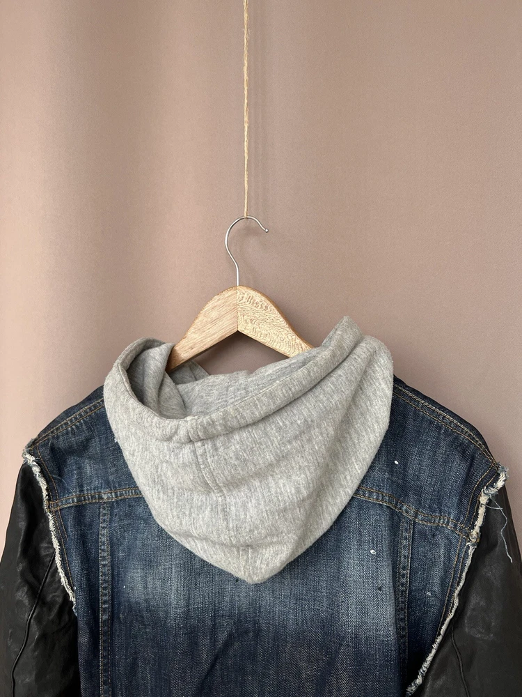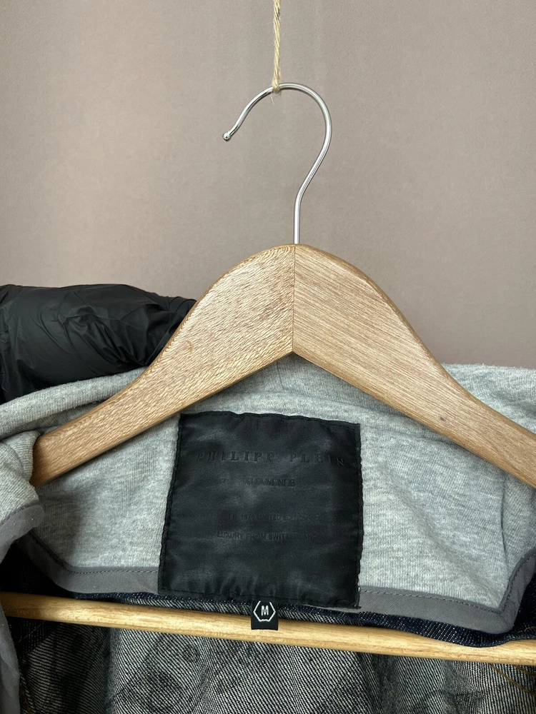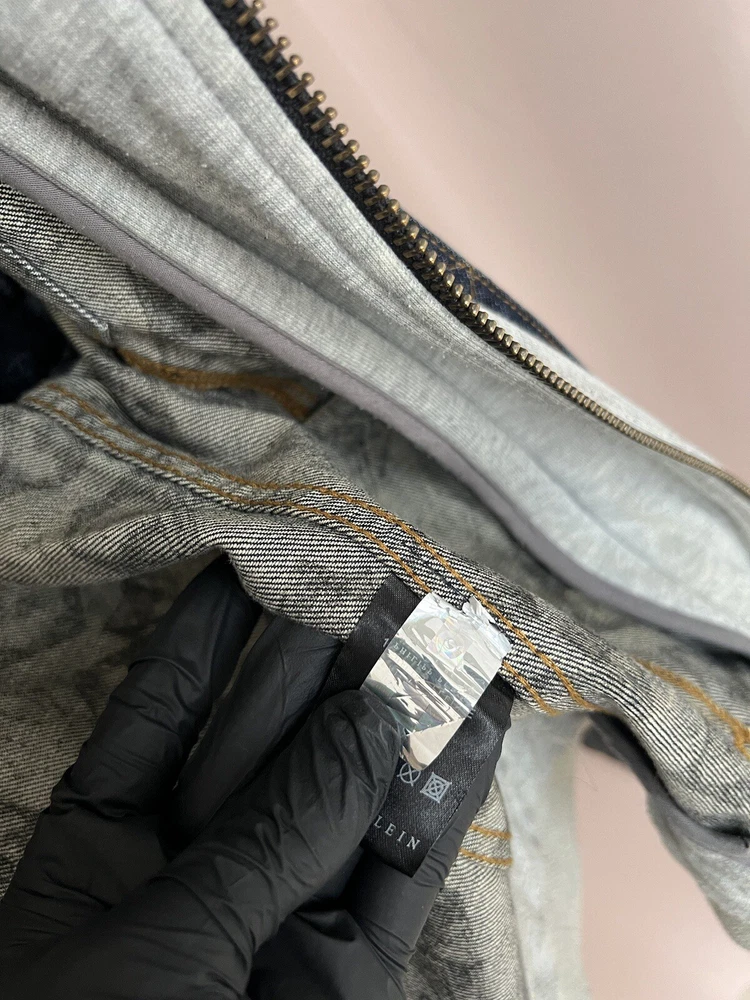 Philipp Plein Denim Hooded Blue Jacket Mens Size M Black Leather Sleeves