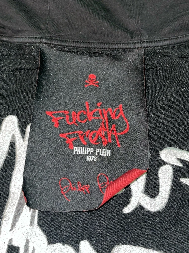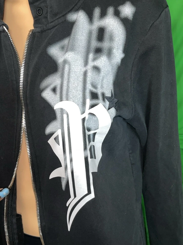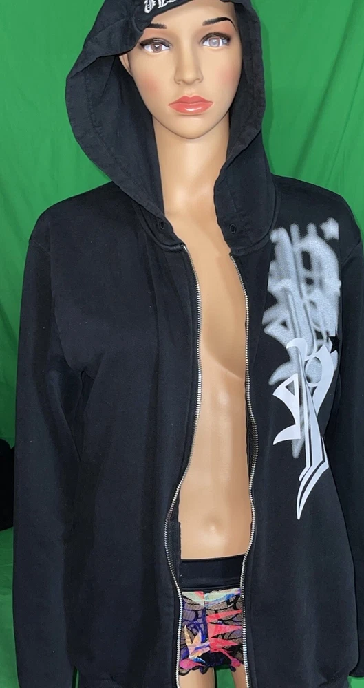 Has some distressing on the back. Missing a bottom piece from the zipper so it does not zip. Also missing the hoodie strings. Please see pictures for more details. Comes from a pet and smoke free home!! Please message me with any questions and thanks for looking!!