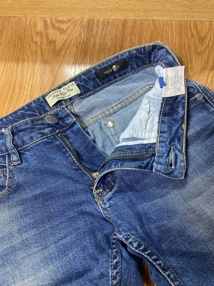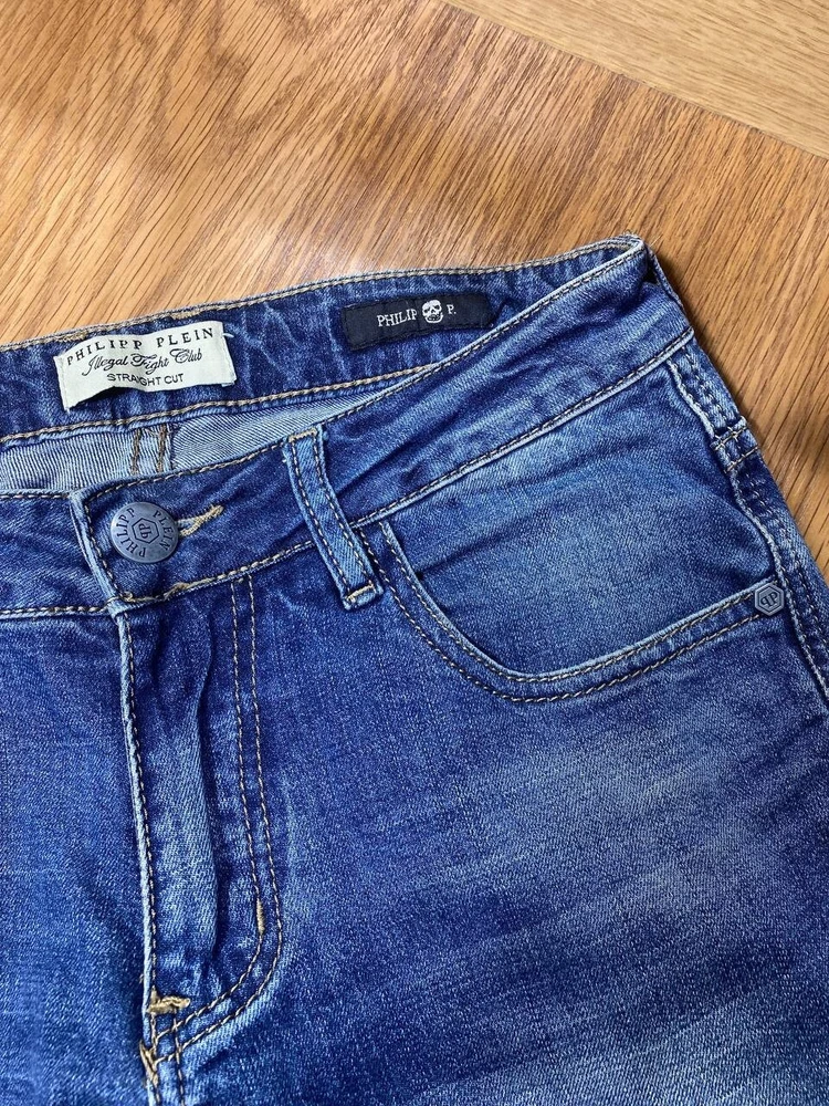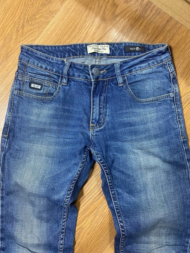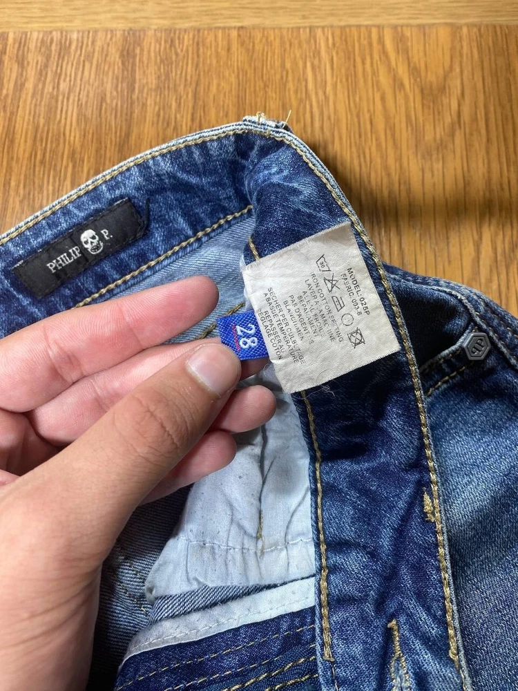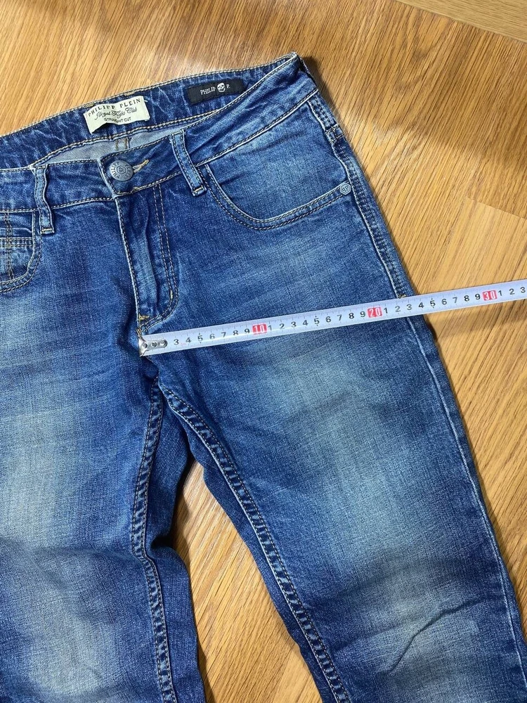 Size Type: Regular Inseam: 28 in Style: Skinny Size: 28 Type: Jeans Accents: Logo, Zipper Department: Men Pocket Type: 5-Pocket Design Closure: Button, Zip Features: Distressed Fit: Slim Fabric Type: Denim Color: Blue Brand: Philipp Plein