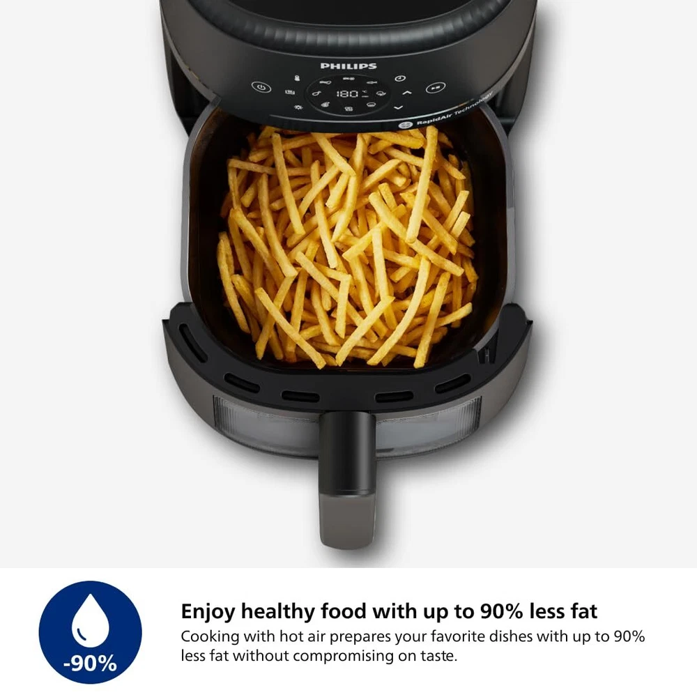 Transform your kitchen with the Philips 2000 Series Air Fryer NA220/00, designed to redefine how you cook. Utilizing advanced RapidAir technology, this air fryer delivers crispy, golden-brown results with up to 90% less fat*, promoting healthier cooking habits and with the cooking window, watch while your food is cooking and see when it's done to perfection. The intuitive touchscreen interface offers easy navigation through 13 cooking functions, ensuring precise control over your meals. Its 4.4 quarts (4.2L) capacity caters to families and dinner parties alike, while the cooking window allows you to monitor dishes as they cook. Simplify your kitchen routine with Philips’ innovative approach to modern cooking. Deliciously crisp with RapidAir technology 13 cooking methods at the touch of a button Save time and lower your energy bills Perfect size for any kitchen with a 4.2 L pan Enjoy healthy food with up to 90% less fat*