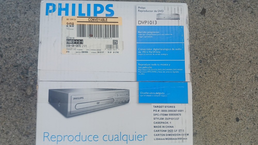 _desc_:Introducing a dream player that promises flawless, true-to-life picture quality and the ability to play virtually any disc! This Philips DVD player delivers your movies and music entertainment experience right in your personal environment.Type:DVD Playergtin13:0609585171886Progressive Scan:With Progressive ScanFeatures:Parental Lock, Progressive ScanDepth:9.25inAudio Dac:24 Bit / 192kHzHeight:1.46inMPN:DVP1013/37Number of Discs:1Width:14.17inModel:DVP1013Video Output System:NTSC, PalUPC:0609585171886Weight:4.41lb.Playable Media Format:DVD-R, CD, SVCD, DVD, Picture CD, DVD-RW, VCD, CD-R, JPEG, DVD+RW, CD-RW, DVD+RVideo Dac:12 Bit / 108MHzBrand:PhilipsExterior Color:Silver