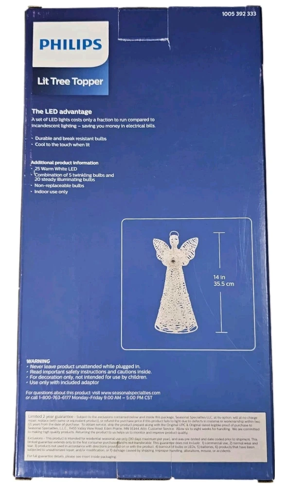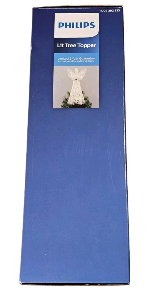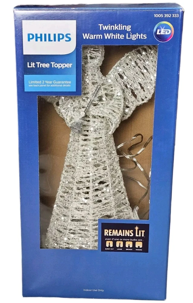 Philips 14-inch Angel Lit Tree Topper with Twinkling LED Warm White Lights Description Decorate with elegance with the Philips 14-inch Angel Lit Tree Topper with Twinkling LED Warm White Lights. This angel is durable and break resistant bulbs. Cool to the touch when lit. Illuminated with 25 warm white LED. Combination of 5 twinkling bulbs and 20 steady illuminating bulbs, Non-replaceable bulbs. Indoor use only. Features Philips 14-inch Angel Lit Tree Topper Durable and break resistant bulbs 25 Warm White LED Combination of 5 twinkling bulbs and 20 steady illuminating bulbs Remains Lit even if one or more bulbs are burnt out, loose, broken, or missing Indoor Use Only (FREE SHIPPING) Perfect like new condition, has only been used once. Feel free to ask any questions you may have. Take a look at our other items. Our inventory grows daily.