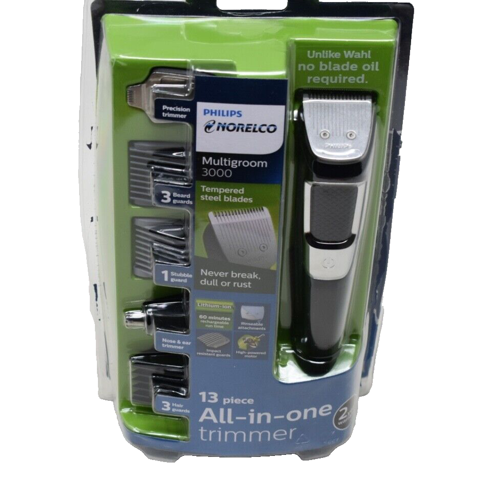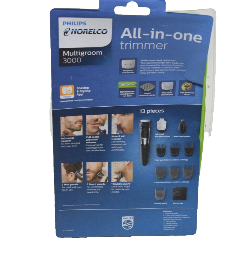 Philips Norelco Multigroom All In One Series 3000 13 attachments NEW Slight Dmg Box (1) Philips Norelco Multigroom All In One Series 3000 13 attachment trimmer 13 pieces for all of your grooming needs: Beard and stubble trimming and maintenance, precision trimmer allows exact placement for sharp lines, nose and ear trimmer taking care of unwanted hairs DualCut technology: 2x more self-sharpening blades. The steel blades sharpen themselves as they work Easily clean blades and guards by detaching from handle and rinsing under water Powerful lithium battery delivers up to 60 minutes of run time.