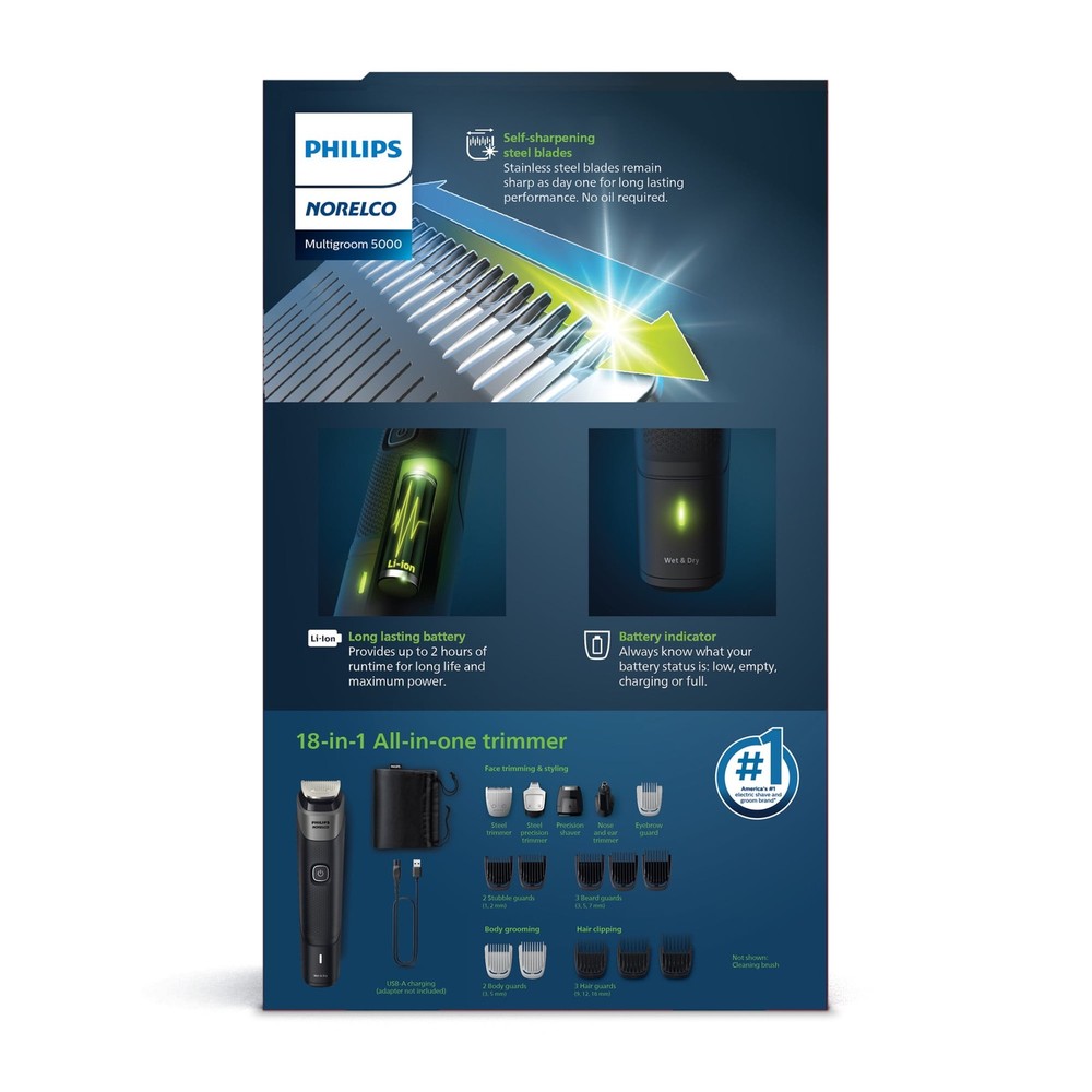 The Philips Norelco Multigroom 5000 is the all-in-one trimmer for maximum versatility. Craft your own personal look with this durable trimmer, which includes 18 quality tools for styling your face, hair, head and body, including below-the-belt grooming. The stainless steel self-sharpening blades remain sharp as day one for long lasting performance, no blade oil required. The long lasting lithium ion battery provides up to 2 hours of runtime for long life and maximum power. Plus the no-slip rubber grip improves comfort and control. Includes USB-A charging cable (wall power adapter not included). 18 tools and accessories. Steel trimmer, Steel precision trimmer, Precision shaver, Nose and ear trimmer, Eyebrow guard, 2 body guards, 2 stubble guards, 3 beard guards, 3 hair guards, soft pouch, cleaning brush and USB-A charging cable (wall power adapter not included). All-in-one trimmer for face, head and body styling: 18 pieces for all your trimming needs. The stainless steel self-sharpening blades remain sharp as day one for long lasting performance, no blade oil required Includes body combs for body and groin grooming Lithium battery delivers 2 hours of cordless run time with battery light indicator to know when it's time to charge. Cordless use only. Fully washable: easy to clean and maintain
