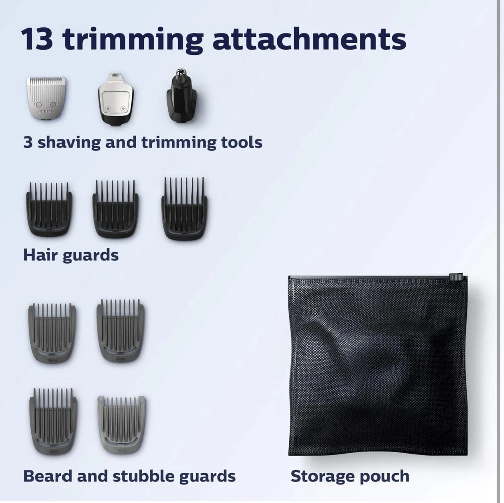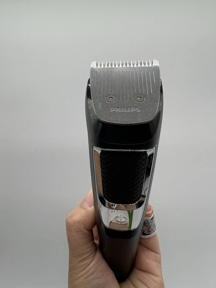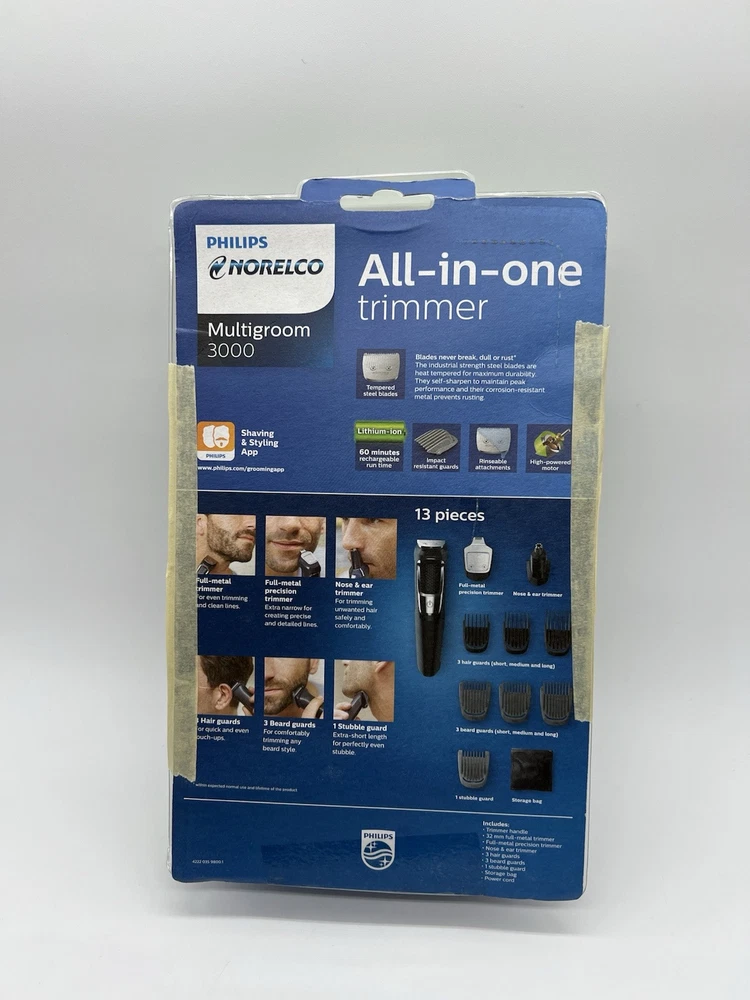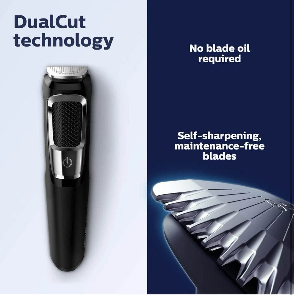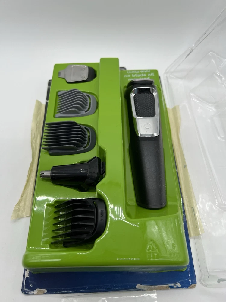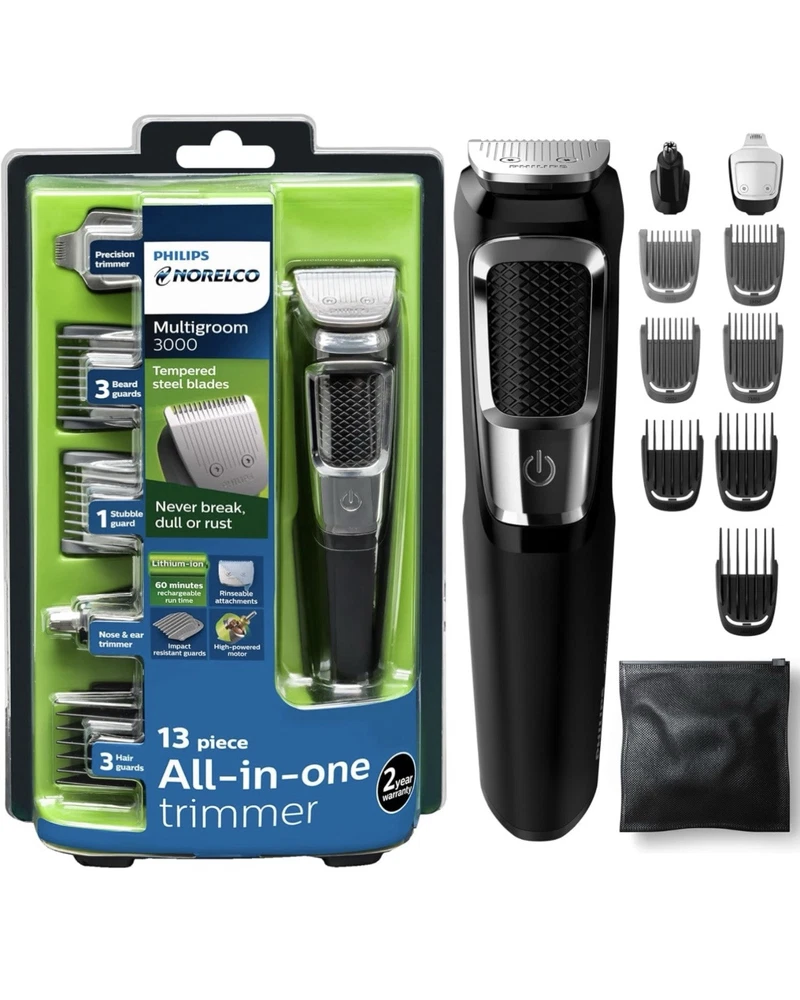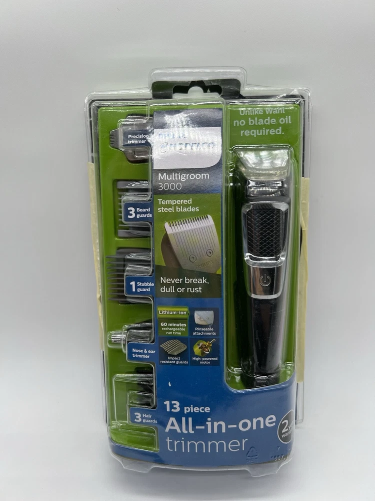 Philips Norelco Multigroom Trimmer, Series 3000, MG3750 ( R4(7) Used, Tested it works. The DualCut trimmer blades sharpen themselves as they work, resulting in longer lasting, maintenance-free blades. Unlike the competition, NO BLADE OIL IS NECESSARY. Steel blades and guards are easy to detach and rinse, allowing for quick cleaning without worrying about rust. Rechargeable lithium ion battery offers 60 minutes of use. The trimmer can be used even while charging, or after a 5 minute quick-charge. Use for all hair types, moustaches, and beards. Includes: Steel trimmer, steel precision trimmer, nose and ear trimmer, 3 hair trimming guards, 3 beard trimming guards, stubble guard, accessory travel storage bag, and cleaning brush.