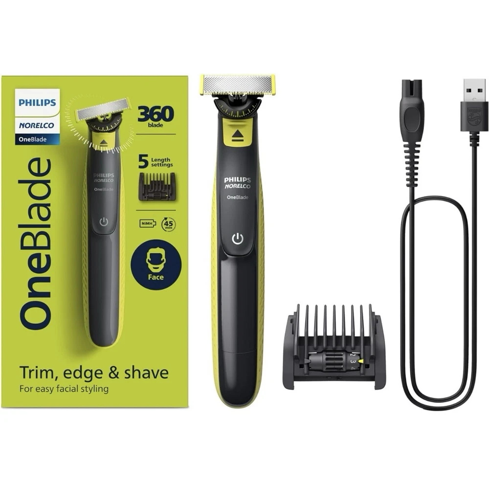 Philips Norelco OneBlade 360 Face Hybrid Electric Beard Trimmer QP2724/90 (Q6(10) It’s brand new, open box. OneBlade Technology: the fast-moving cutter (12,000x min) is efficient, even on longer hairs; the dual Protection System with glide coating plus rounded tips makes shaving easier and more comfortable Innovative 360 Blade: it can flex in all directions to enable constant skin contact and control; easily trim and shave, even the most difficult-to-reach areas with fewer passes and greater comfort¹ Designed to cut hair not skin: trim your beard to an even stubble length with the 5in1 comb (1-5mm), create precise edges thanks to the dual-sided blade, and shave off any length of hair easily Easy grooming anywhere: take it in the shower and use wet or dry; 45-minute battery with USB charging and compact handle make it the perfect travel companion The set includes: 1x Philips Norelco OneBlade 360, 1x 360 Blade, 1x 5in1 adjustable comb (1-5mm), 1x protection cap, 1x USB-A charging cable, a user manual (power adapter not included)