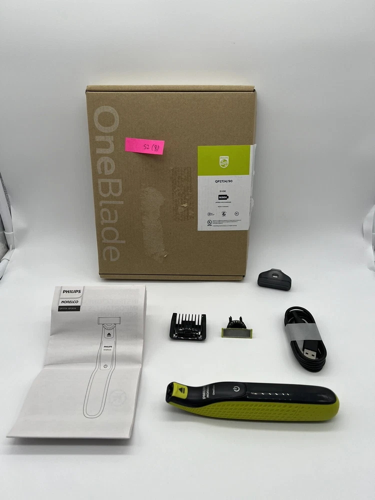 Philips Norelco OneBlade 360 Face Hybrid Electric Beard Trimmer QP2724/90 (S2(8) It’s brand new, open box. OneBlade Technology: the fast-moving cutter (12,000x min) is efficient, even on longer hairs; the dual Protection System with glide coating plus rounded tips makes shaving easier and more comfortable Innovative 360 Blade: it can flex in all directions to enable constant skin contact and control; easily trim and shave, even the most difficult-to-reach areas with fewer passes and greater comfort¹ Designed to cut hair not skin: trim your beard to an even stubble length with the 5in1 comb (1-5mm), create precise edges thanks to the dual-sided blade, and shave off any length of hair easily Easy grooming anywhere: take it in the shower and use wet or dry; 45-minute battery with USB charging and compact handle make it the perfect travel companion The set includes: 1x Philips Norelco OneBlade 360, 1x 360 Blade, 1x 5in1 adjustable comb (1-5mm), 1x protection cap, 1x USB-A charging cable, a user manual (power adapter not included)