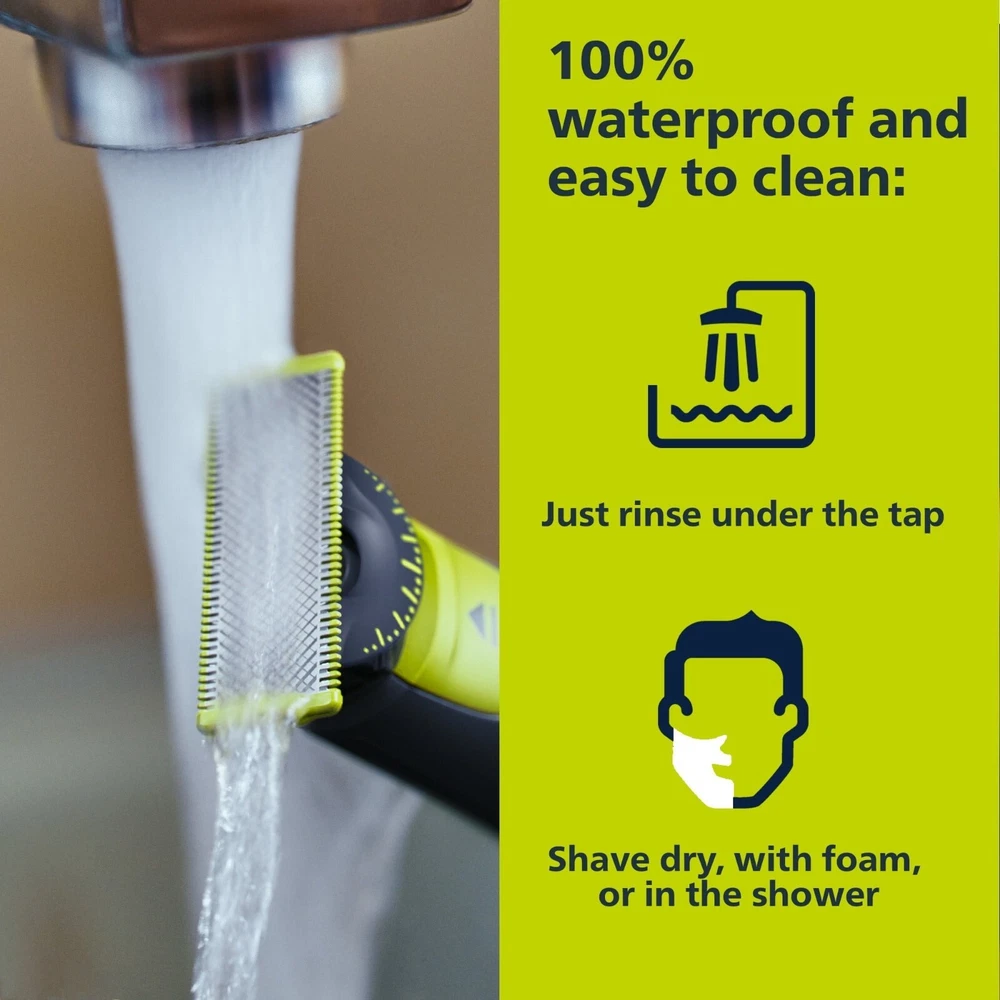 Philips Norelco OneBlade 360 Face + Body trims, edges and shaves any length of hair, even on body. OneBlade 360 Face + Body includes one blade for your face, and another blade with a click-on skin guard for your body. The unique OneBlade shaving technology integrates a fast moving cutter (12000x per minute) with a dual protection system to give you an efficient comfortable shave on longer hairs. The innovative 360 Blade can flex in all directions to adjust to the curves of your face. Easily trim and shave hard‐to‐reach areas — with few strokes and great comfort. OneBlade does not shave too close, so your skin stays comfortable. Click on the 5-in-1 stubble comb for face or use the additional blade with click-on skin guard and 3mm body comb for a fast and even trim on your body and below-the-belt. Forget about using multiple tools, OneBlade 360 Face + Body does it all. OneBlade is fully waterproof, so it is easy to clean. Just rinse it under the tap. You can shave wet or dry, even in the shower. No shaving foam needed. Stainless steel blade lasts up to 4 months of use** to keep that fresh feel. An eject icon will appear on the blade when it's time to consider changing the blade for the best shaving experience. The Lithuim Ion battery delivers up to 60 minutes of run time after a 4 hour charge. 1 handle, 1 360 blade for face, 1 blade for body, 1 5-in-1 comb for face, 1 skin guard for body, 1 body comb, 1 USB-A charging cord (adapter not included), 1 protective cap Rechargeable OneBlade 360 Face + Body can trim, edge, and shave any length of hair. Shave is not too close so your skin stays comfortable. The innovative 360 Blade can flex in all directions to adjust to the curves of your face. The design enables constant skin contact and control. Includes 2 blades, 1 360 blade for your face and 1 blade for your body. Use wet or dry, with or without foam. Click-on skin guard for extra protection on sensitive areas, even below the belt. Includes a 5-in-1 stubble comb + 1 body comb for an even trim on face or body Features Adjustable Brand Philips Norelco Assembled Product Weight 0.44 lb Manufacturer Part Number QP2834/70 Assembled Product Dimensions (L x W x H) 1.46 x 3.94 x 7.87 Inches