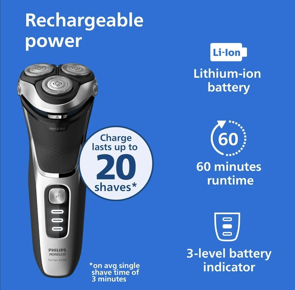 Philips Norelco Shaver 3800 Wet & Dry S3311/85 Used, tested it works. Missing travel pouch. Item: Q2(24) Enjoy a clean shave that follows your face's contours with 5-directional pivot, flex and floating movements. The head reaches your face at the ideal angle and adjusts to the curves of your face and neck, creating smooth contact with your skin. Get a convenient dry shave or a refreshing wet shave with gel or foam, even in the shower. With ComfortCut blades, you get a clean shave that's comfortable on your skin. Rounded caps shield 27 self-sharpening blades to gently cut hair just above skin level and help the shaver glide smoothly over your skin. Finish your look with the built-in pop-up trimmer. It’s ideal for maintaining your mustache and trimming your sideburns. Shave for up to 60 minutes on a 1-hour charge - that's about 20 shaves - with the powerful Li-ion battery. A 5-minute quick charge gives enough power for one shave. Operates in cordless mode only.