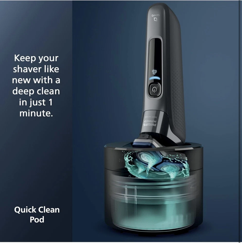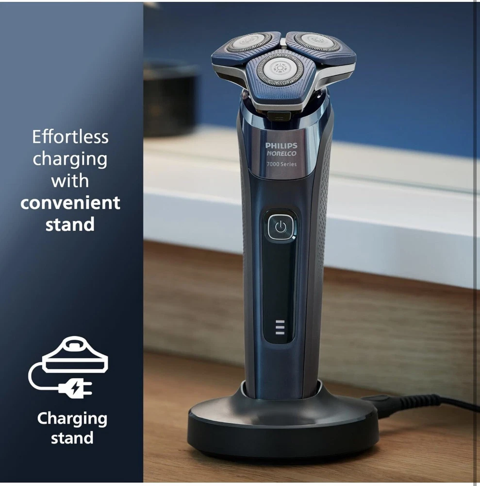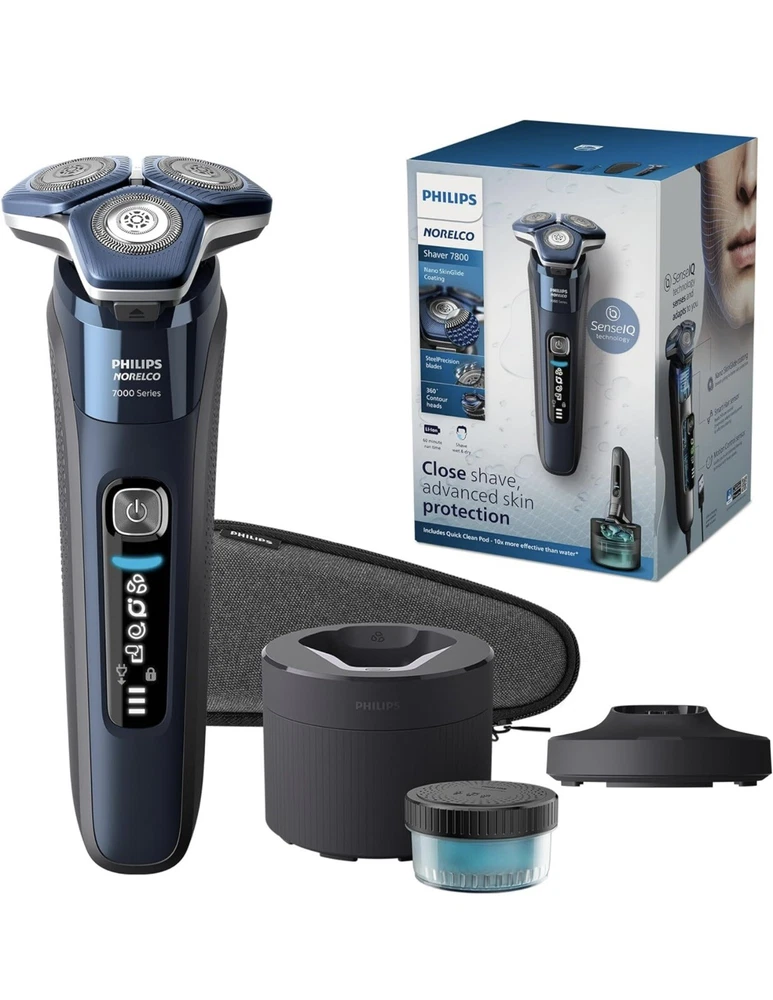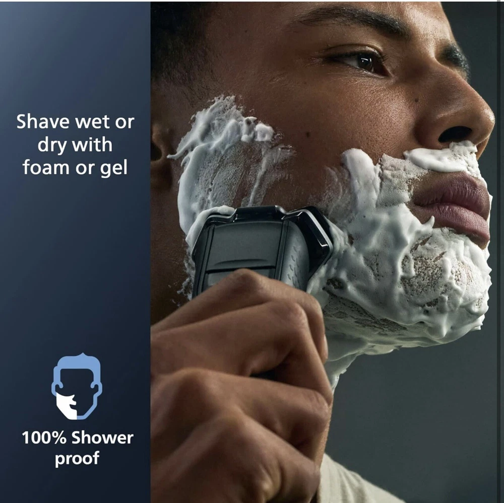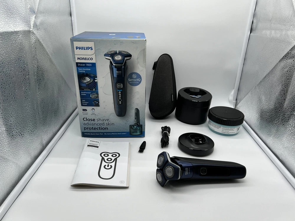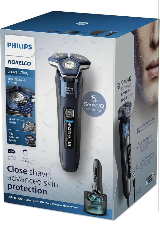 Philips Norelco Shaver 7800 Rechargeable Wet & Dry Electric Shaver S7885 (R2(24) It’s brand new, open box, damaged box! Made of up to 250,000 micro-tech beads per square cm, Nano SkinGlide coating improves gliding on skin by up to 30%*, to minimize irritation. With up to 90,000 cutting actions per minute, the SteelPrecision blades shave close, cutting more hair per stroke*. The 45 high-performance blades are self-sharpening and made in Europe. The intelligent facial-hair sensor reads hair density 250 times per second. The technology dynamically auto-adapts cutting power for an effortless and gentle shave. Motion-sensing technology tracks how you shave and guides you to an improved shaving technique with fewer passes. Fully flexible heads turn 360° to follow your facial contours. Experience optimal skin contact for a thorough and comfortable shave. Charge your shaver fully in just 1 hour with the powerful and energy efficient lithium-ion battery. In a hurry? Plug in your shaver for 5 minutes and get enough power for 1 full shave. (wall adapter NOT included) Adapt your shaving routine to your needs. With Wet & Dry, you can go for a comfortable dry shave or a refreshing wet shave. You can shave with gel or foam even under the shower. Complete your look using the shaver's pop-up precision trimmer. Integrated into the shaver's body, it's the perfect way to maintain a mustache and trim sideburns.