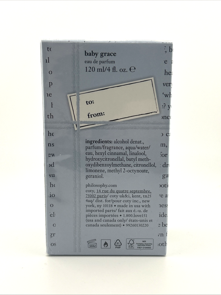 Philosophy Baby Grace Eau de Parfum – 4oz / 120ml – Sealed Christmas Edition Experience the delicate and comforting scent of Philosophy Baby Grace Eau de Parfum , a soft and clean fragrance designed to evoke a sense of warmth and serenity. This limited Christmas Edition makes a perfect gift or a luxurious addition to your fragrance collection. Key Features: ✔ Soft, fresh, and delicate scent ✔ Long-lasting Eau de Parfum formula ✔ Limited Christmas Edition – perfect for gifting ✔ Sealed & brand new ✔ Size: 4oz / 120ml ✔ Condition: Sealed, Brand New 🎁 Fast Shipping & Trusted Seller! Perfect for holiday gifting or everyday wear.