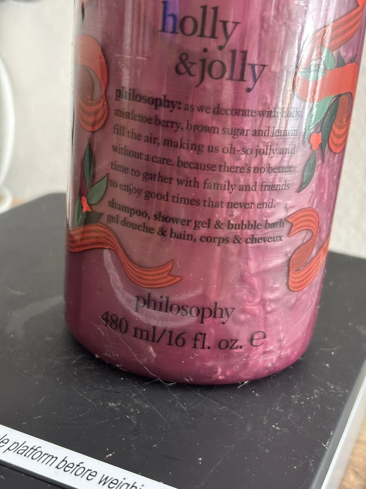 Scent: Holly & Jolly gtin13: 3616302514625 MPN: does not apply Brand: Philosophy Features: 3 in 1 Ingredients: Sugar Color: Berry Size: 16 ounce Skin Type: All Skin Types Product Line: Holiday 2021 Formulation: Gel, Liquid Type: Shower Gel Body Area: Body Volume: 16 fl oz UPC: 3616302514625