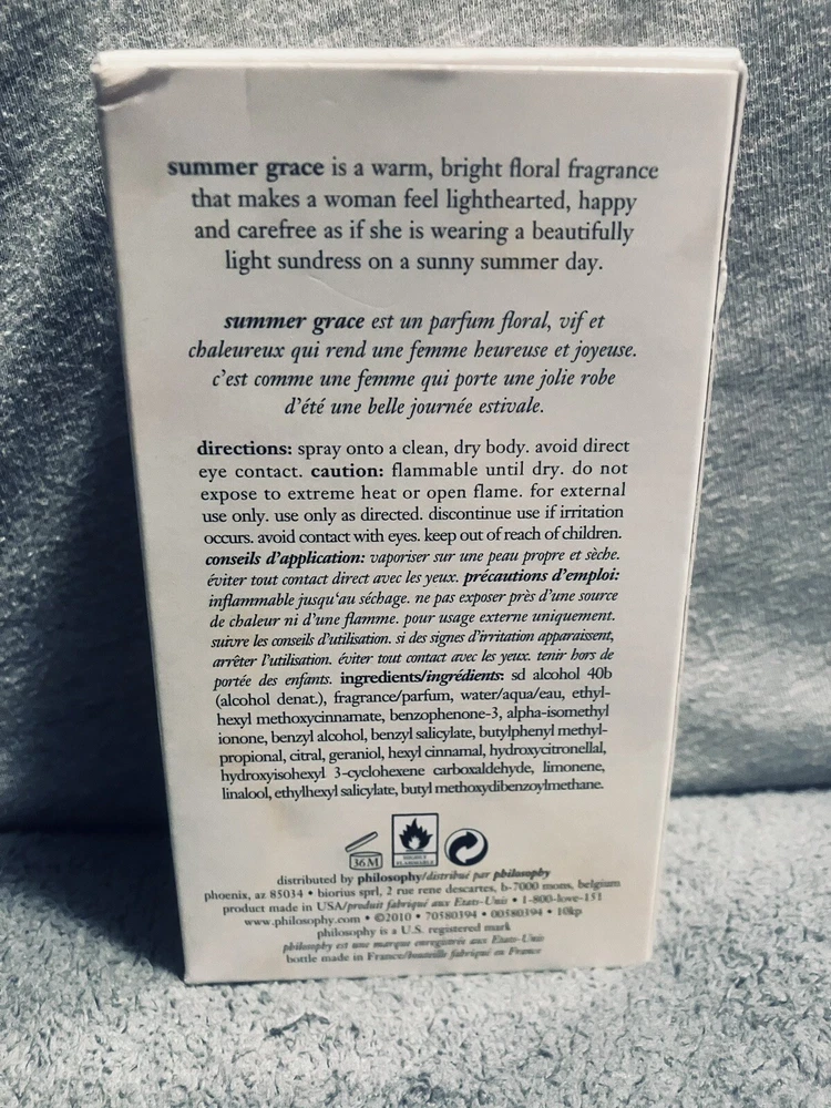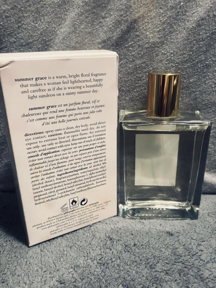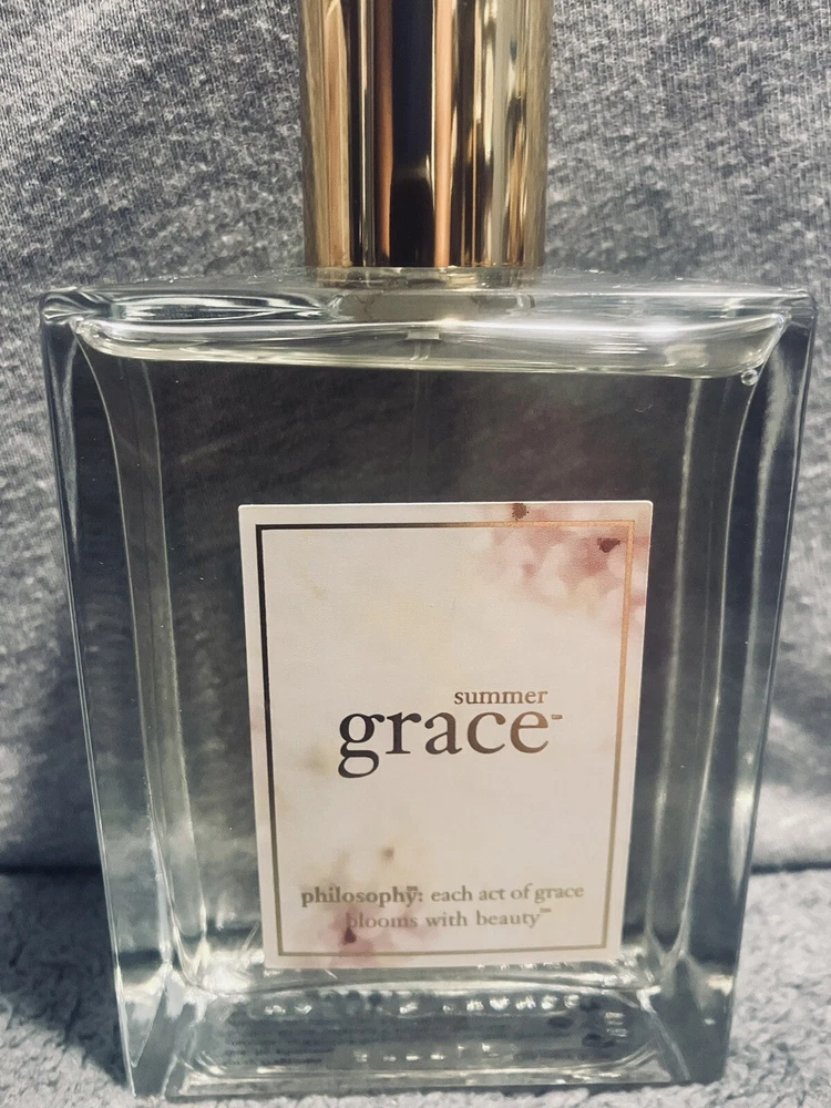 A NEW OPEN BOX 4oz Philosophy Summer Grace Eau De Toilette Spray ...**THIS ITEM WAS PURCHASED SPRAYED APPROXIMATELY 3 TIME DIDNT LIKE THE SMELL & SPRAYED TO CONFIRM THE PUMP WORKS**…..Check out the pictures and judge the condition for yourself and feel free to ask any questions before purchasing. THANKS FOR LOOKING and remember the FREE SHIPPING!