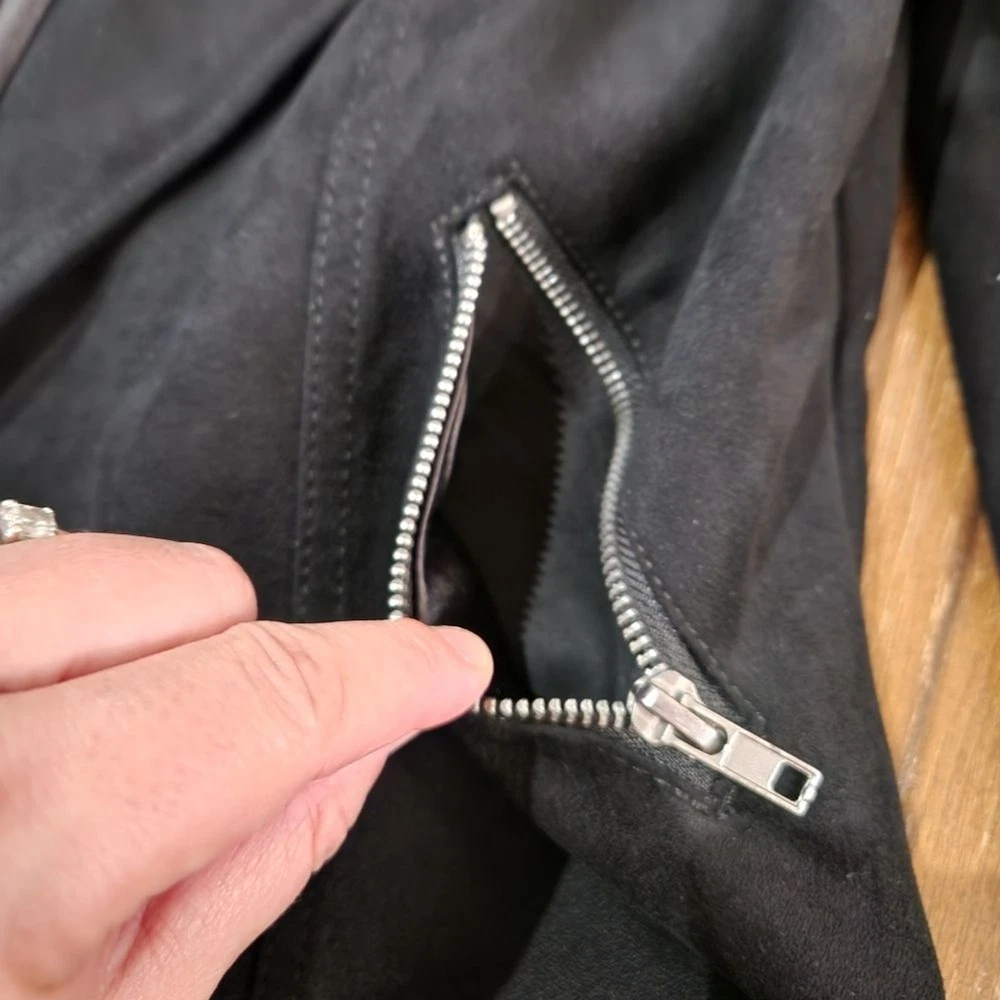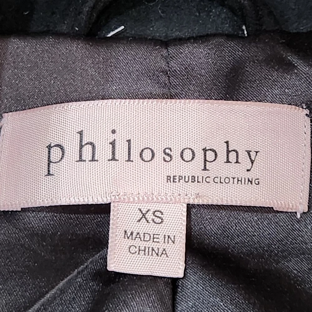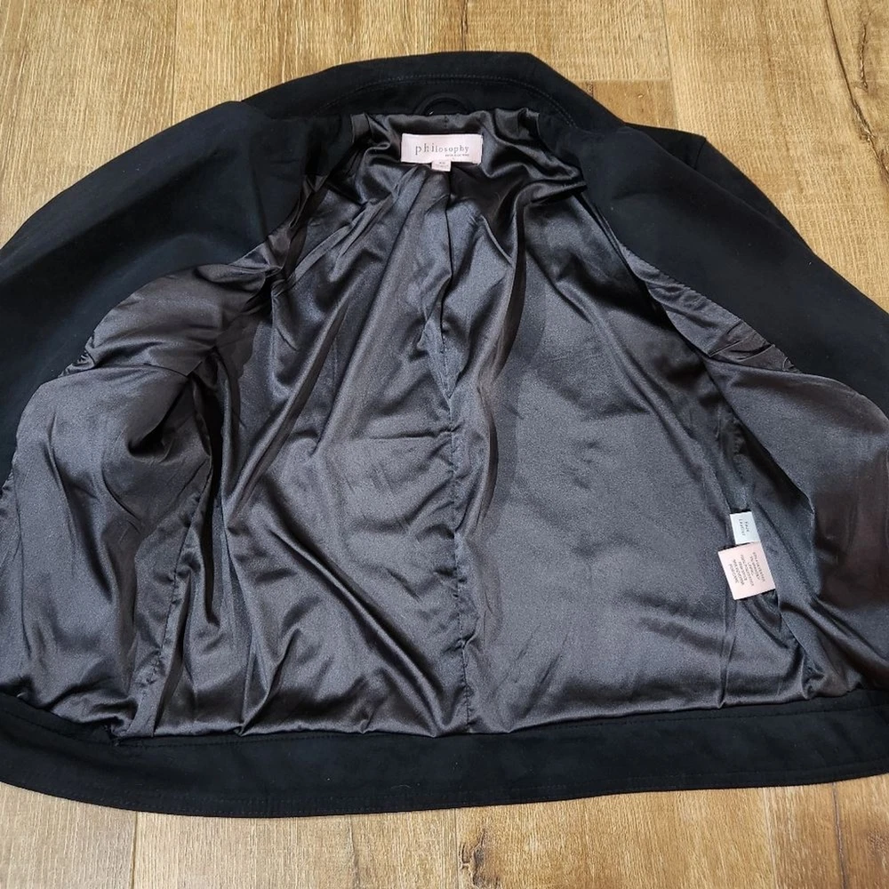 Featuring a stylish Philosophy women's faux suede black moto jacket in a size XS. This is a perfect style that you can throw on over any outfit. It's a great style that you can wear from day to night. It is an open style with no closure. There are two slant zipper functional pockets. It is a slightly more cropped style. It's in fantastic condition. Add it to your closet today! brand: Philosophy size: XS fabrication: faux leather: 92% polyester/ 8% spandex lining: 100% polyester measurements: approximate pit to pit: 19.5" pit to hem: 11" shoulder to hem: 20.5" sleeve length: 23"