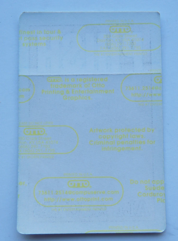 This listing is for a single backstage pass as shown and described above..These came in a large collection of passes from the owner of Otto Passes, David Otto...Otto Passes have been a go to name for artist for more than 40 years.. Please see the attached photo(s) and e-mail me with any questions prior to purchase...Stated shipping is inside the Continental USA. PLEASE NOTE....WE SHIP ON TUESDAYS AND FRIDAYS!!!